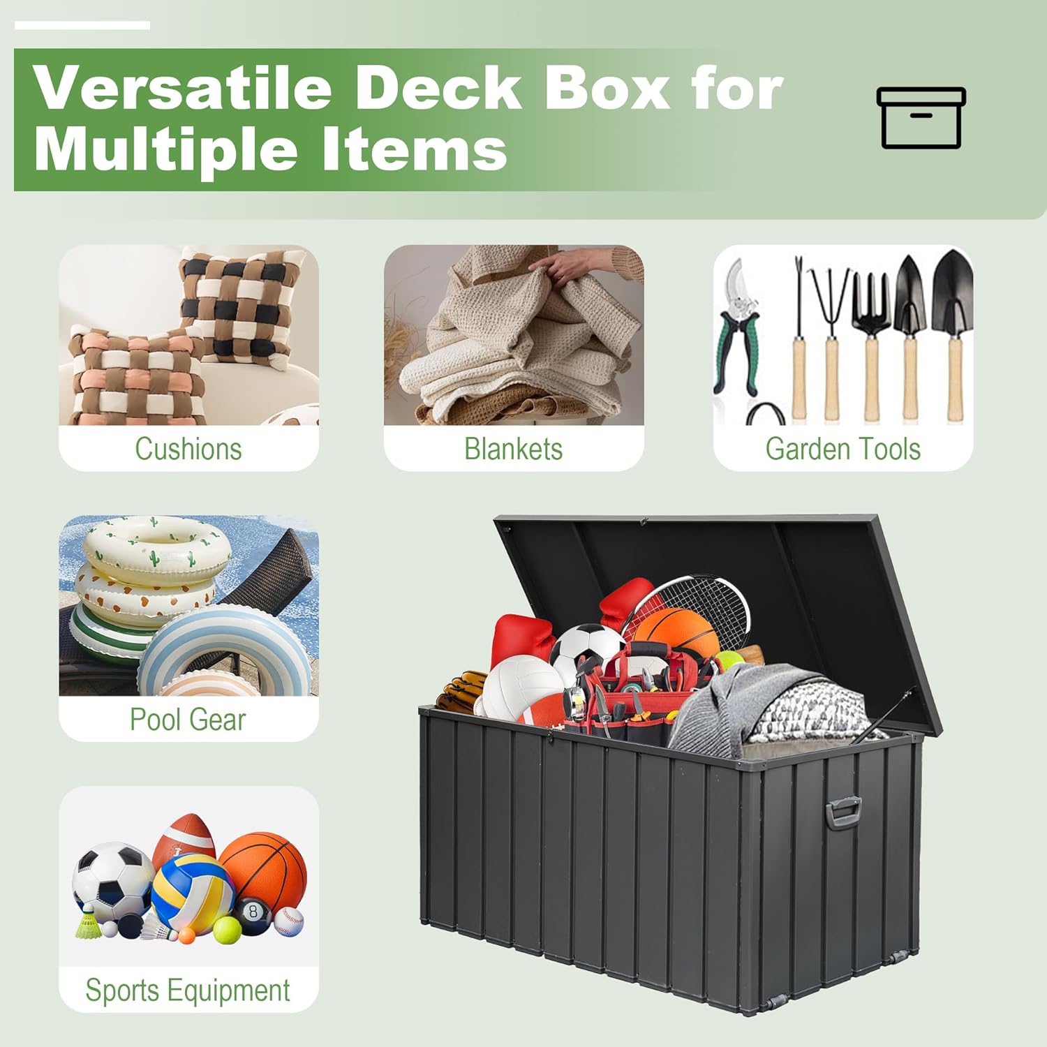 • Diverse Storage: This storage container can hold a variety of items, such as pillows, cushions, garden tools, and sports equipment. It helps save space while keeping your belongings organized and easy to access.