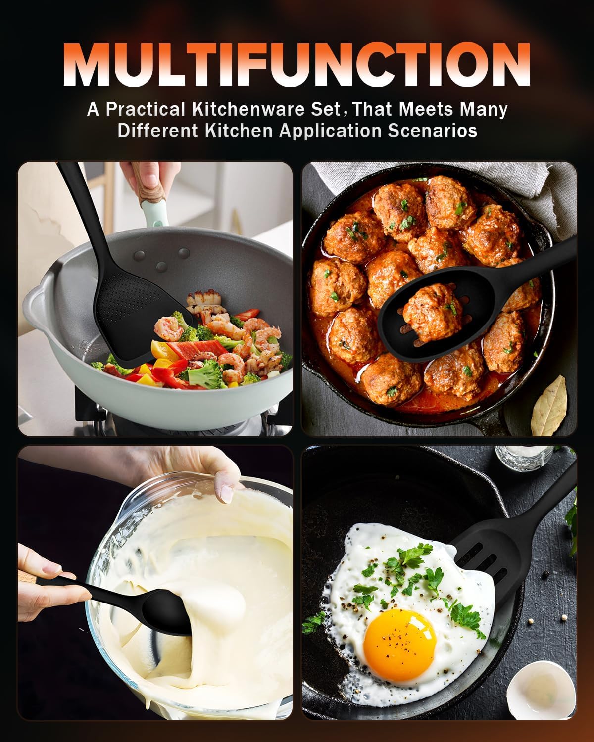 Silicone Cooking Utensils Set, Perfectly Angled for Frying, Mixing,Serving,Draining,Turning and Stirring, BPA-Free Matte Silicone, Wood Handles, Safe for Nonstick Cooking Surfaces,4 Pack (Black)