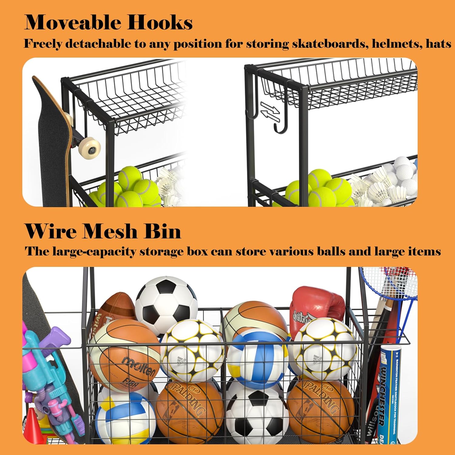 • Large Capacity Storage: The ball storage rack have two large storage boxes can store various ball toys, sports equipment and other large items. Four encrypted and deepened movable net baskets can hold baseballs, helmets, small dumbbells for women and other items. The side racks on both sides can hold rackets, yoga mats, ball barrels and other items that need to be placed vertically. The multiple hooks can store skipping ropes, gloves and other protective items neatly to save space.