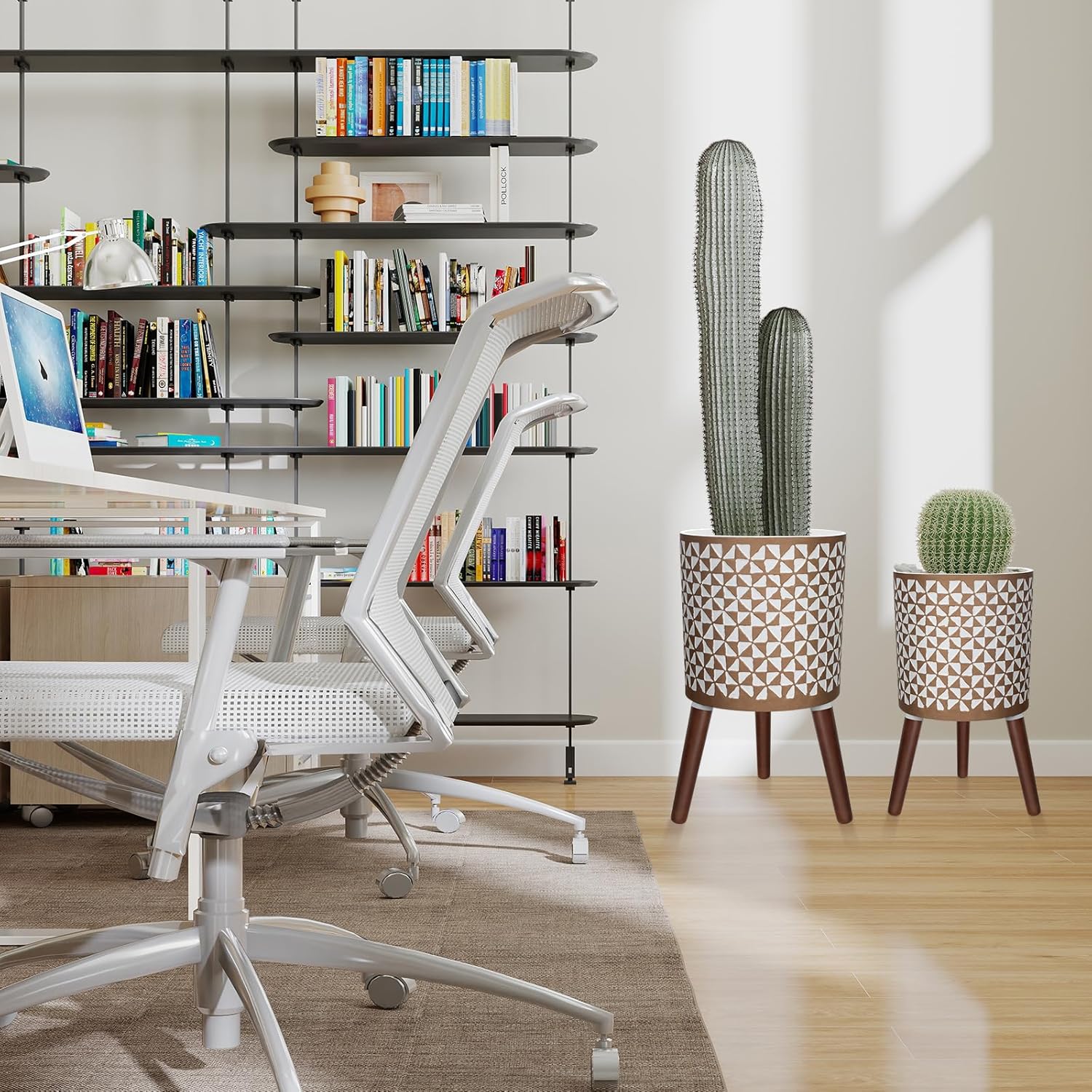 • 【Elegant 3D Pinwheel Design】This planter features a captivating 3D pinwheel pattern in a chic combination of white and gold, perfectly complemented by three sturdy coffee-colored wooden legs. Its unique and eye-catching design adds a modern yet luxurious touch, making it a versatile addition to various decor styles, including contemporary, glam, and mid-century. Ideal for showcasing your favorite plants while elevating the aesthetic of any room.