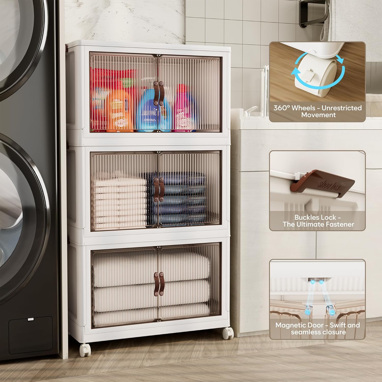 • 【Magnetic Doors & Rotating Wheels】The bins offer two opening options: front or top. The magnetic closure allows easy access. The 4 rotating 360-degree wheels make them easy to move, ideal for use in storage and organization in any room like your closet or bathroom.
