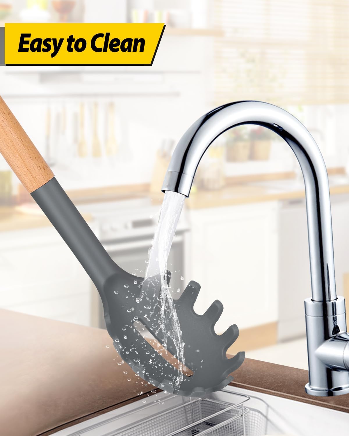 Silicone Pasta Fork and Ladle Spoon Set with Wooden Handle, Heat Resistant Non Stick Kitchen Utensils for Cooking, Stirring, Serving Spaghetti, Soup, Sauce(GRAY)