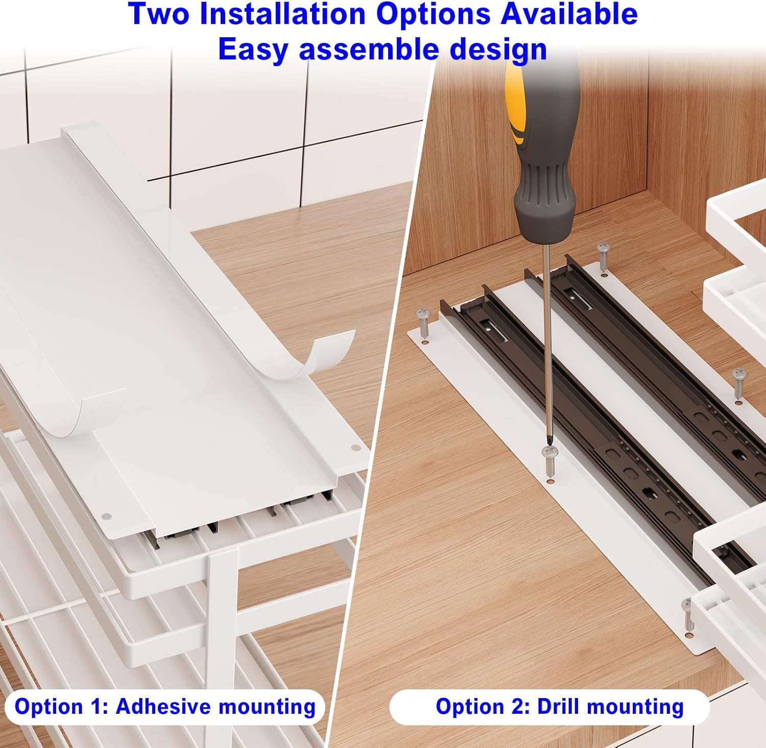 • 【Easy to Install & No Assembly】We offer two installation options: 3M Adhesive strips and drilling mounts. With the adhesive strip option, peel off the adhesive film and adhere it to any applicable surface. For those opting for drilling, we provide all the necessary screw accessories. Our products are designed to require no assembly. You can install them directly into your cabinet after opening the package. It only takes one minute to complete.