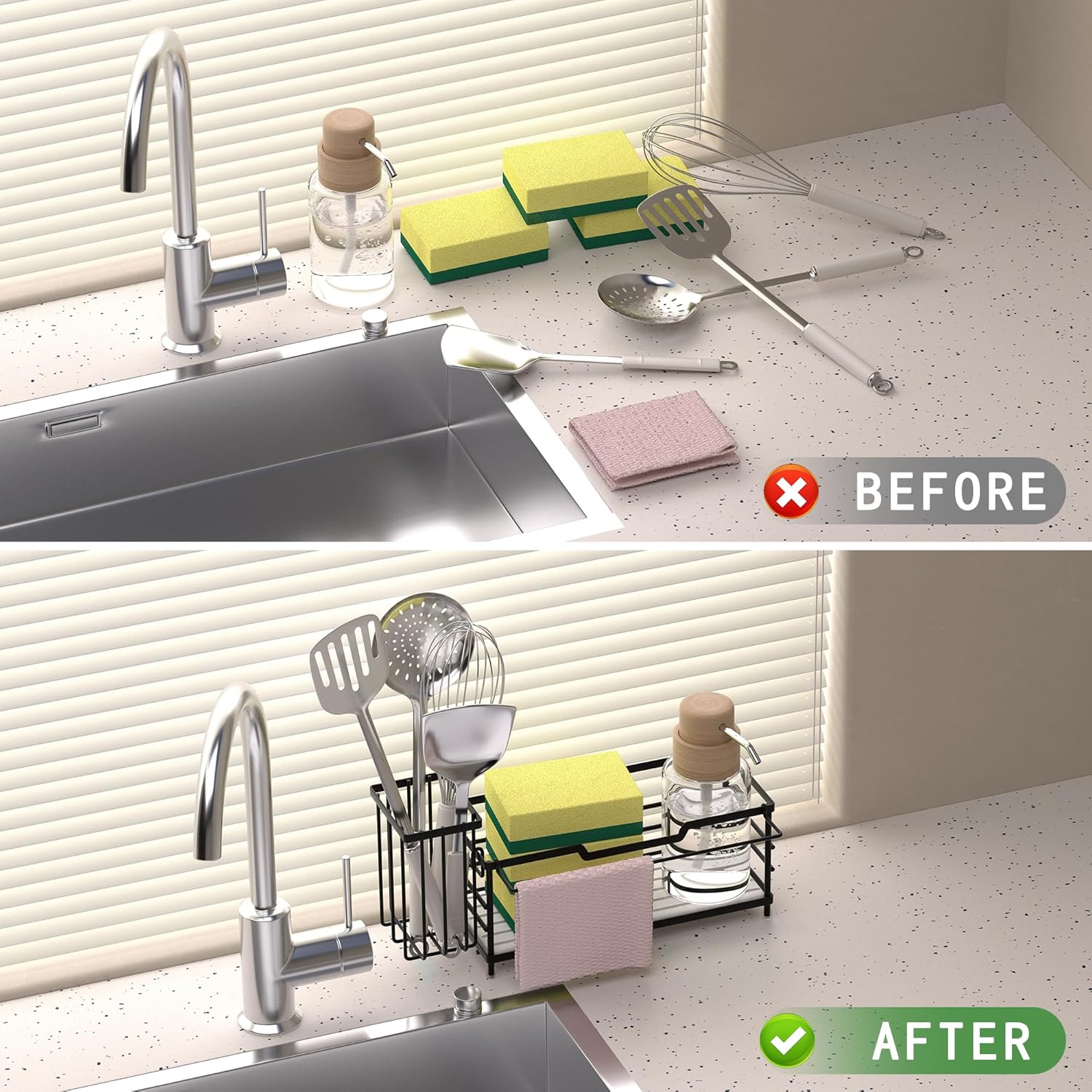 • Multi-Purpose Sink Organizer – Holds soap, sponges, scrub brushes, dish soap, and towels neatly in one place. Ideal for kitchen sink organization or bathroom counter organization.