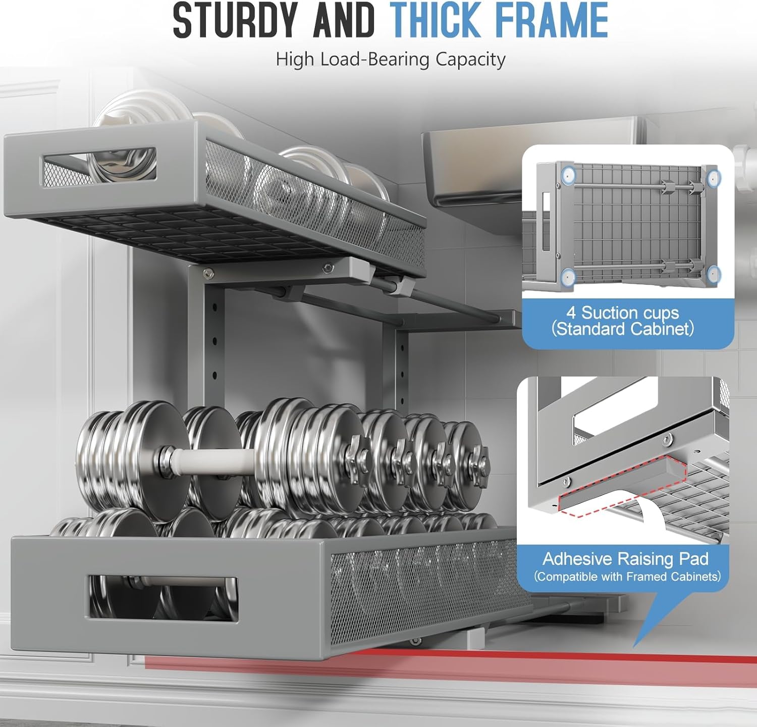 • 【2-Tier Pull-Out Design for Easy Access】This under-sink organizer features a double-layer pull-out design, allowing you to easily access items at the deepest part. The upgraded, thickened iron circular sliding rails ensure a smooth and seamless pulling experience, making each use effortless. The unique pull-out locking mechanism effectively prevents the drawers from being completely pulled out, avoiding the risk of items falling or structural damage caused by over-pulling, ensuring safer.