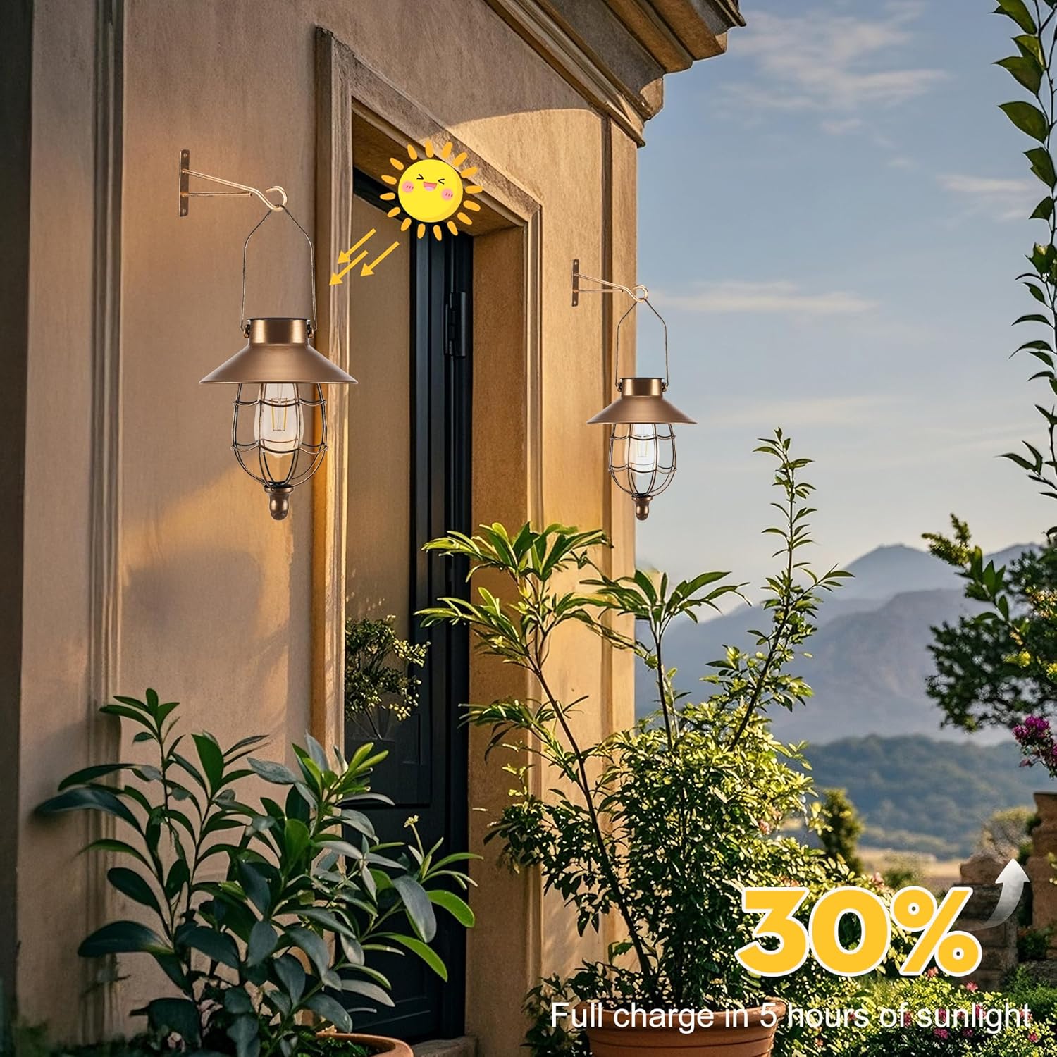 • Solar Wall Light: Designed in traditional vintage style, it perfectly combines classic hanging lanterns with LED bulbs. When night falls, the warm light shines, creating a cozy, warm and relaxing atmosphere for you