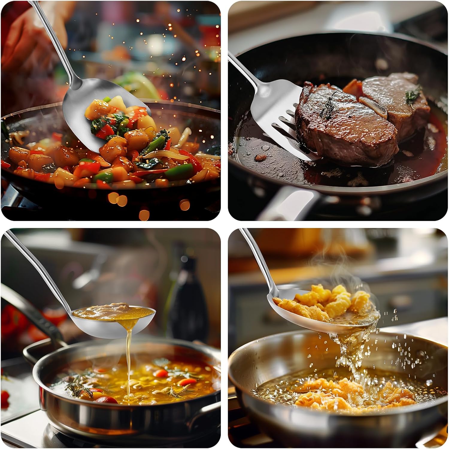 • Sturdy and Long-Wearing: This set of stainless steel wok utensils is a sturdy all-in-one tool that will not bend or break.Unlike wooden kitchenware, stainless steel can last for many years of daily use