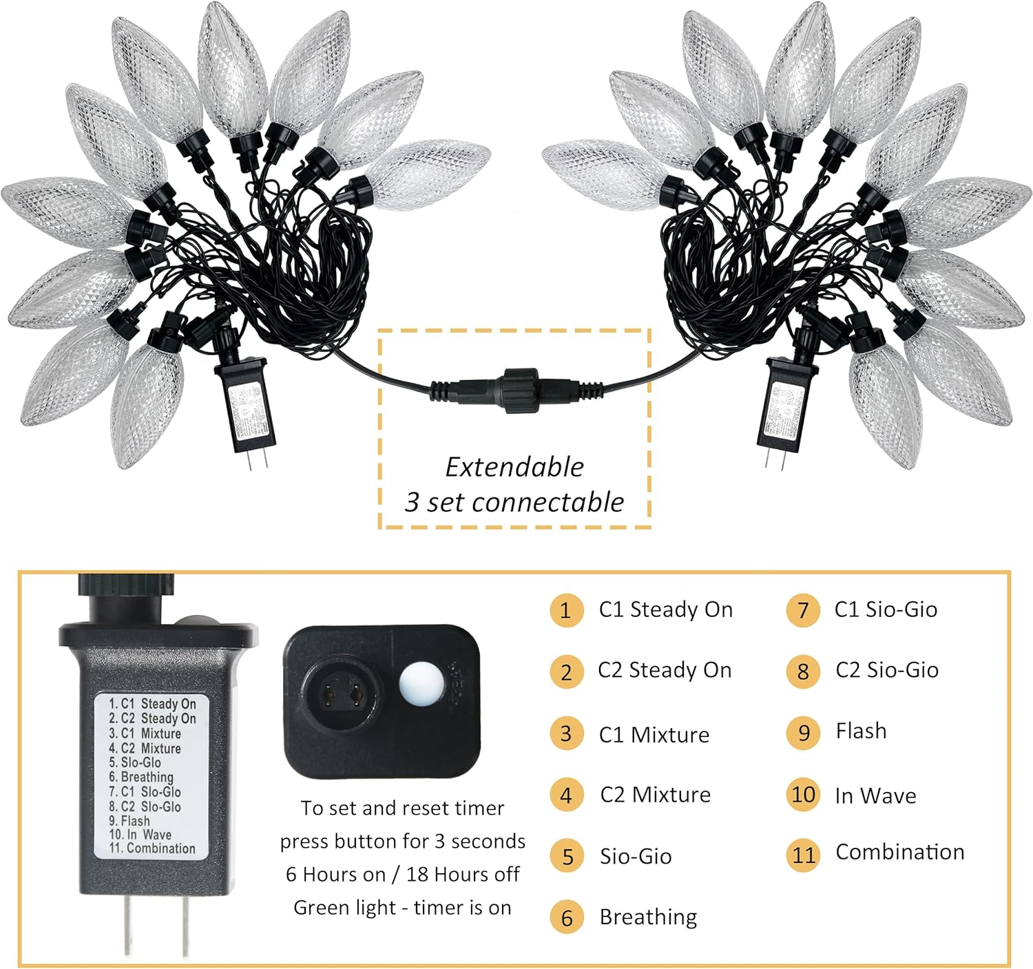 • 【11 Modes Light with Timer & Memory function】 To change the lighting modes, just press the button on the power adapter. There are 11 functions available to suit various occasions. The timer allows the lights to remain illuminated for 6 hours or 18 hours each day. To turn off the timer, simply press the button on the power adapter again or disconnect the lights. The smart memory function retains your selected lighting mode for the next time you turn on the lights.