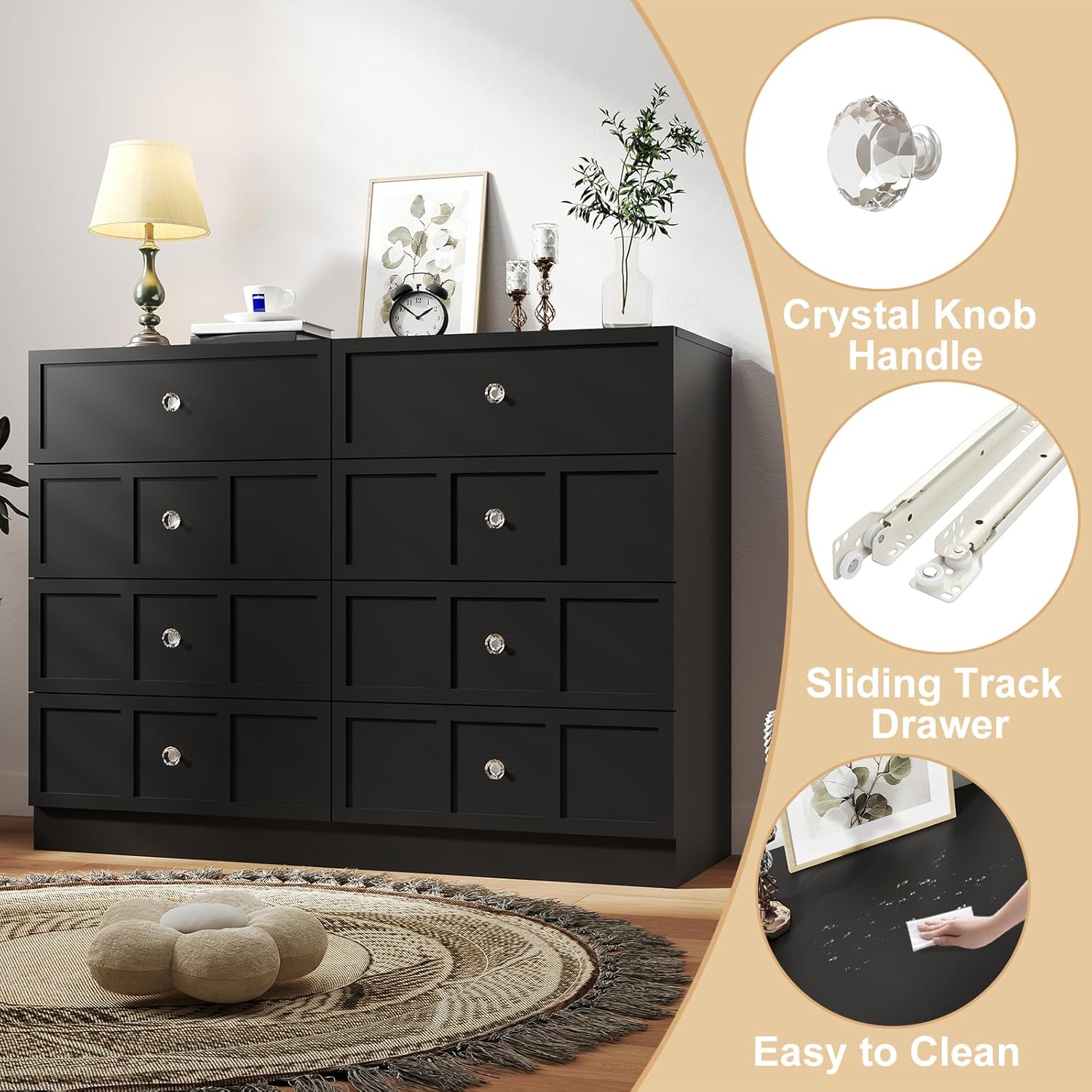 • Premium Materials Crafted for lasting quality, our 8 drawer black dresser for bedroom features high-grade engineered wood with a specially treated surface that's scratch-resistant and easy to clean. A simple wipe restores its pristine finish. The fluted 8 drawer dresser showcases crystal knobs that combine elegant design with satisfying tactile feedback, making every use a pleasure.