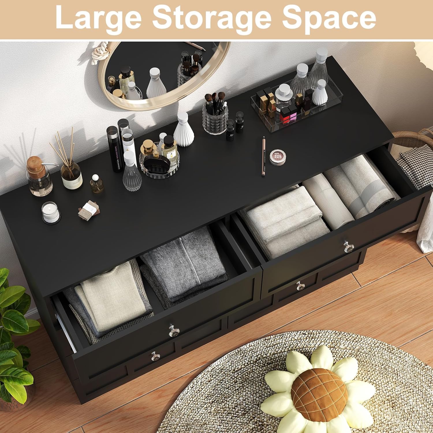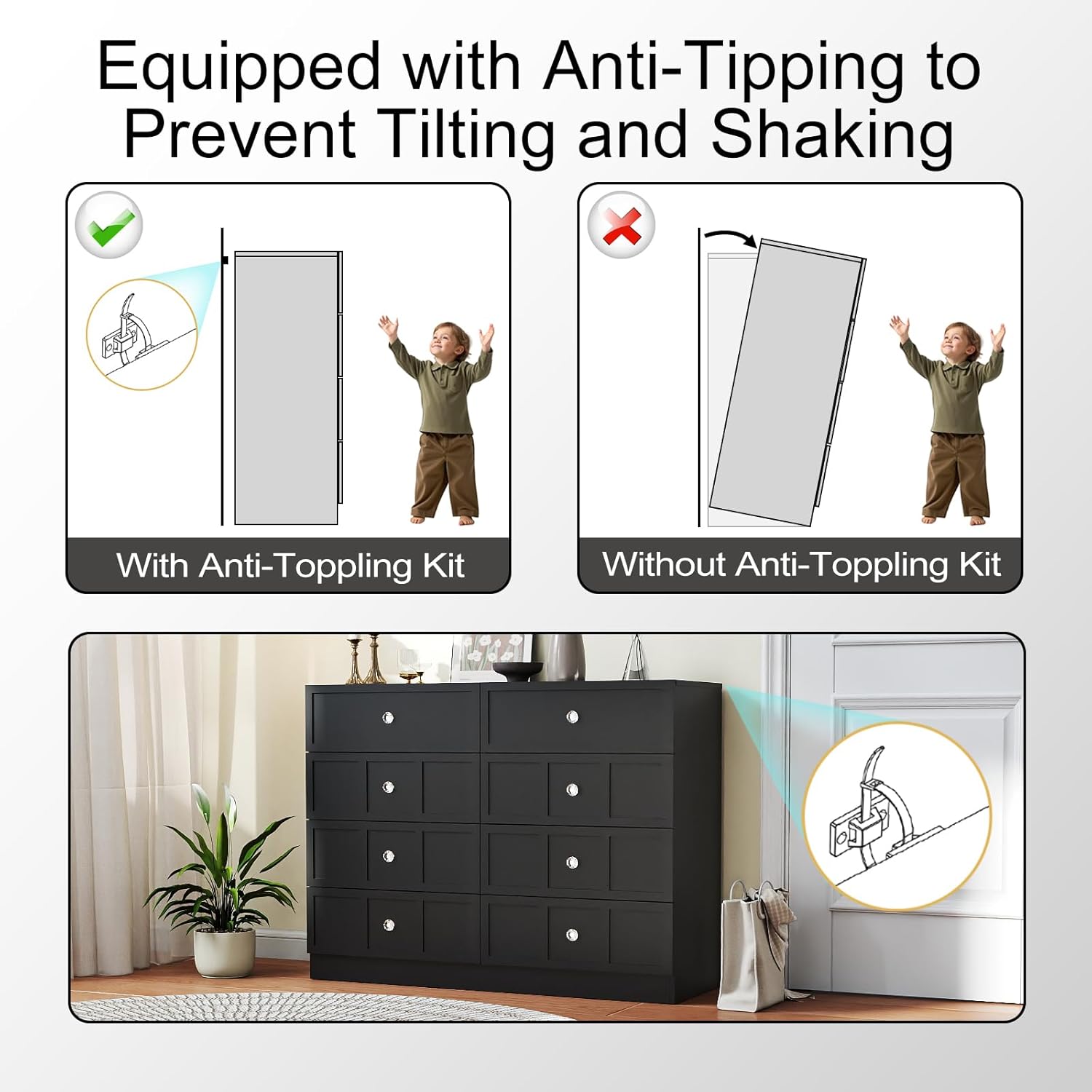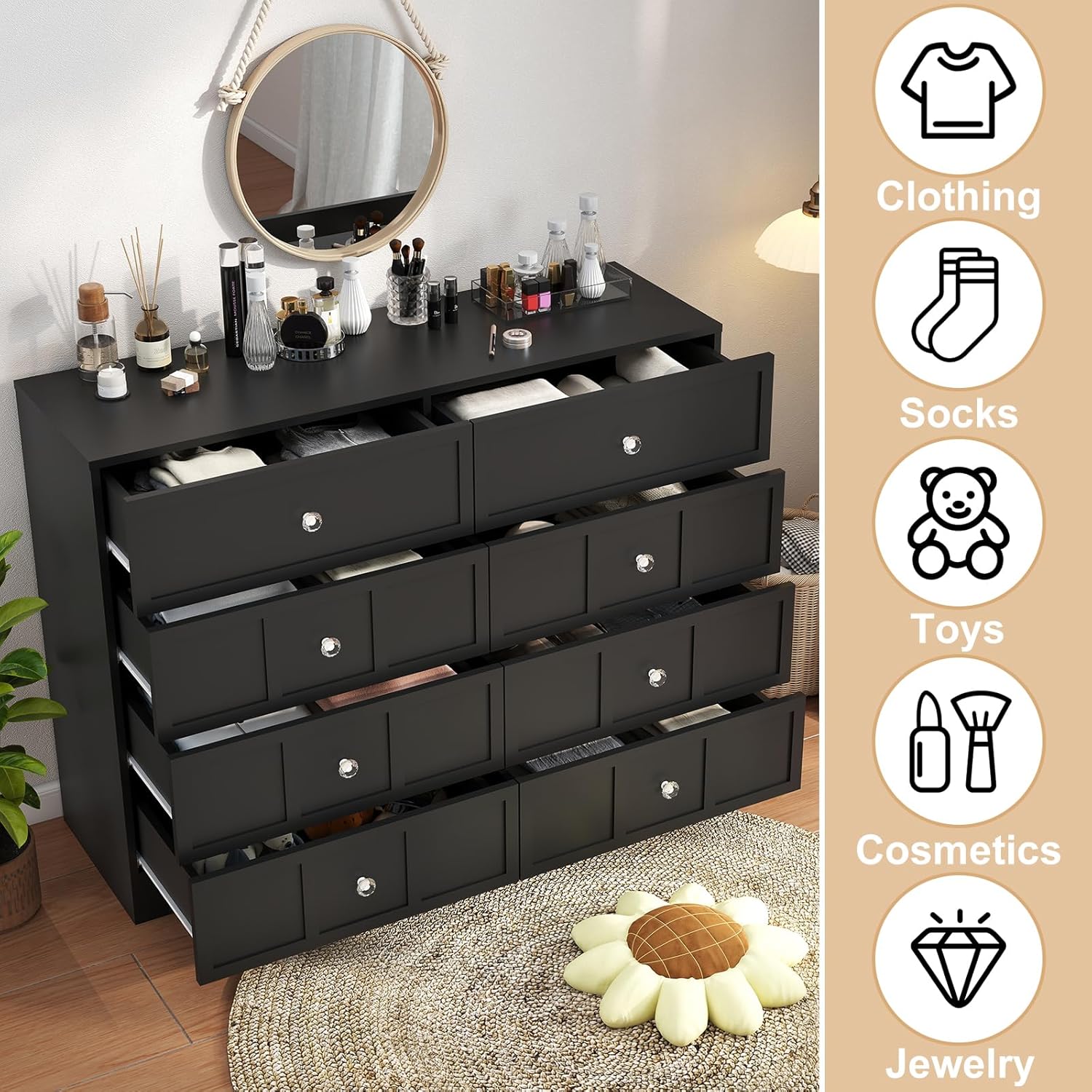 • Durable & Stable Construction Built to last, this black dresser 8 drawer for bedroom features premium ball-bearing drawer glides for smooth operation and exceptional weight capacity. Whether storing clothes, toys or office supplies, the black 8 drawer dresser wide maintains steadfast stability. The black 8 drawer dressers for bedroom retains its flawless performance and appearance even with daily use over time.