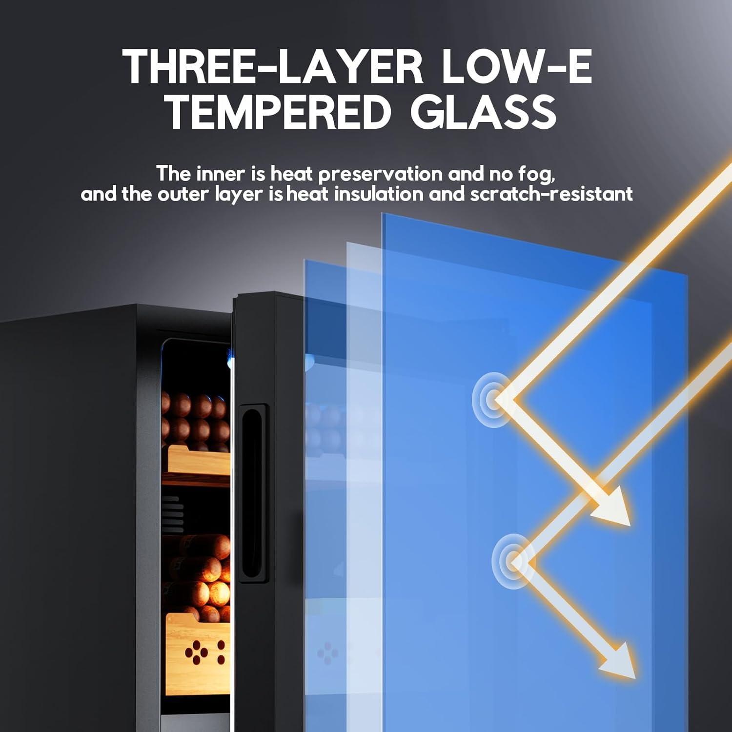 • 【Low-E Triple Tempered Glass Door】We add Low-E composite coating to the middle layer of the glass, which makes the thermal insulation and heat preservation performance of the glass far superior to its peers. Cigar humidor has an Elegant appearance, equipped with a hidden door handle and 4 adjustable non-slip feet, built-in LED blue light, convenient for you to check the status of your cigars. The LED touch screen panel is equipped with a digital thermometer and hygrometer, intelligent control, and faster response.