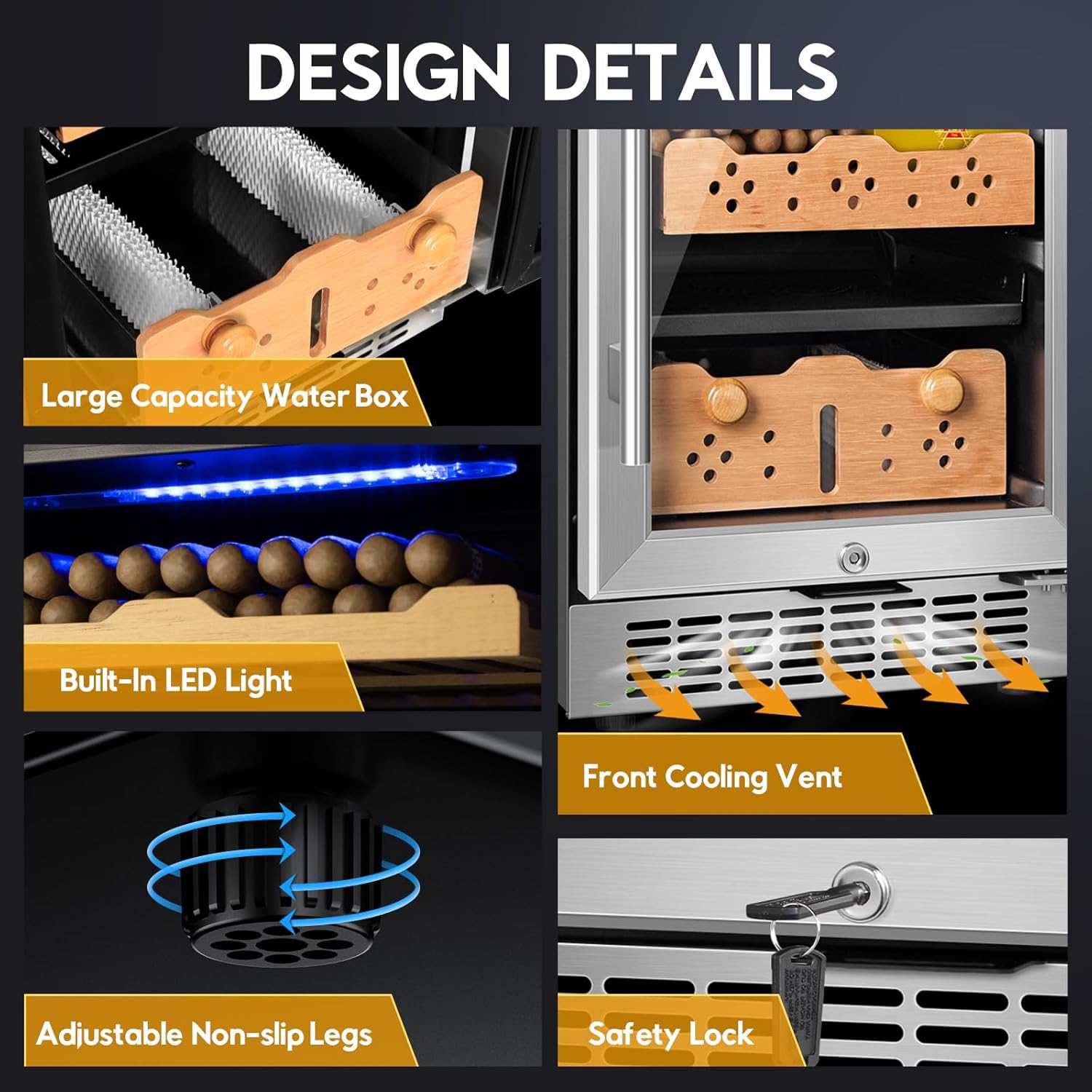 • 【Silent Compressor Cooling& 546 Cigar Capacity】Using silent compressor refrigeration technology, compared with semiconductor refrigeration, the compressor service life is increased by 30%, refrigeration speed is increased by 40%, temperature and humidity fluctuation ≤1, noise ≤ 35dB, no vibration, so you can enjoy life without worry. Front air outlet and 4 adjustable non-slip feet, which can be built-in or under-counter. The electric humidors for cigars have a capacity of up to 88L and can hold up to 546 cigars (depending on ring gauge). It is equipped with a safety lock to ensure the security of your precious collection.