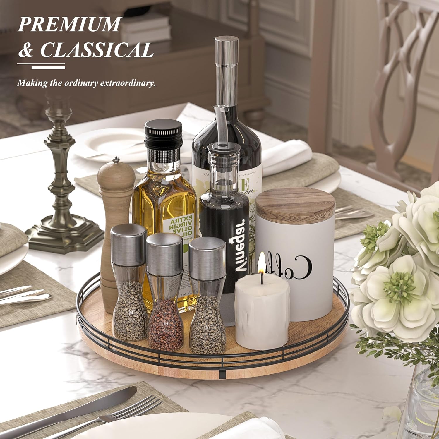 • UPDATED DESIGN: With larger wood base on this lazy Susan for table top, the turntable organizer doesn't wobble, even with heavier items on it. With premium oak wood and classical iron fence make this lazy Susan turntable stylish, functional and adding a touch of rustic charm. it’s also very easy to clean. There are included anti-slip pads on the bottom of the lazy Susan for extra surface protection.
