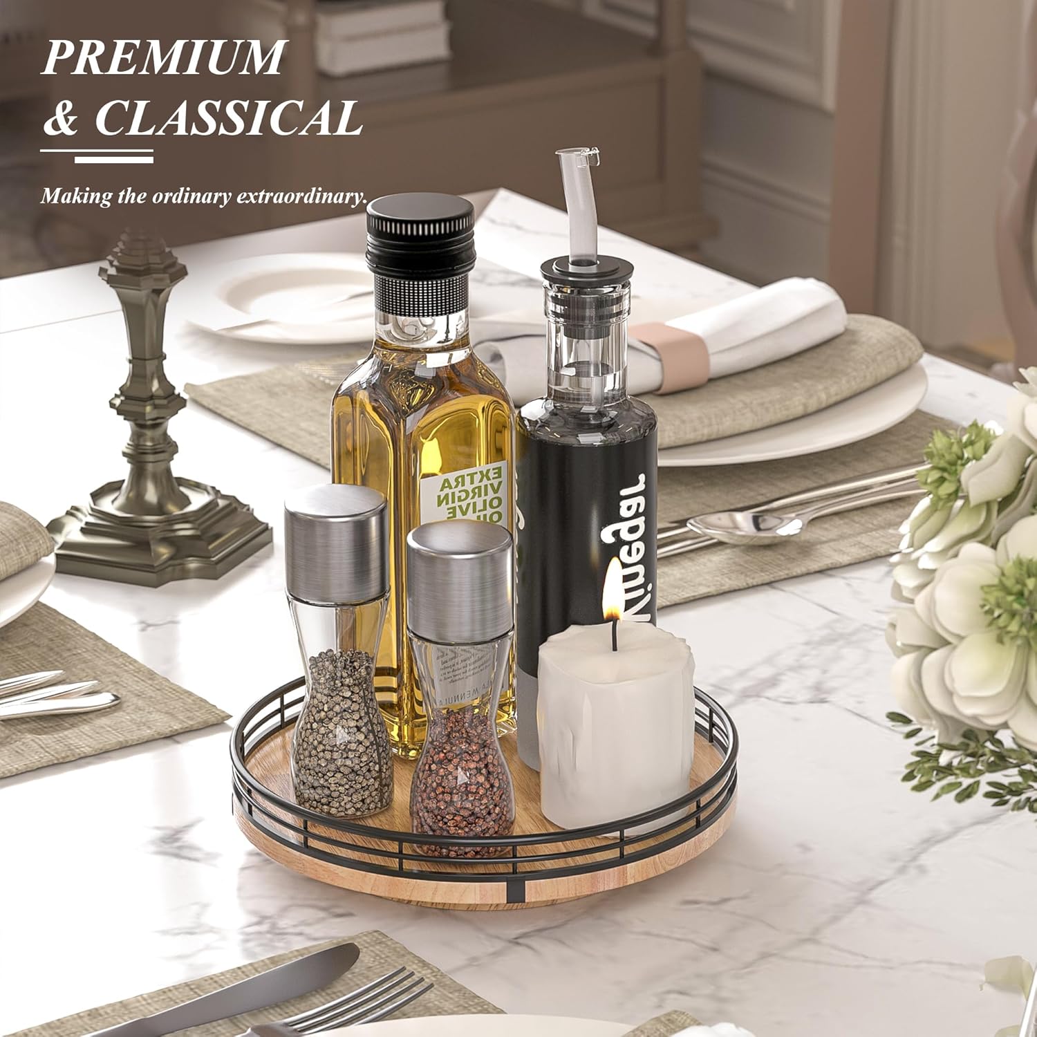 • UPDATED DESIGN: With larger wood base on this lazy Susan for table top, the turntable organizer doesn't wobble, even with heavier items on it. With premium oak wood and classical iron fence make this lazy Susan turntable stylish, functional and adding a touch of rustic charm. it’s also very easy to clean. There are included anti-slip pads on the bottom of the lazy Susan for extra surface protection.