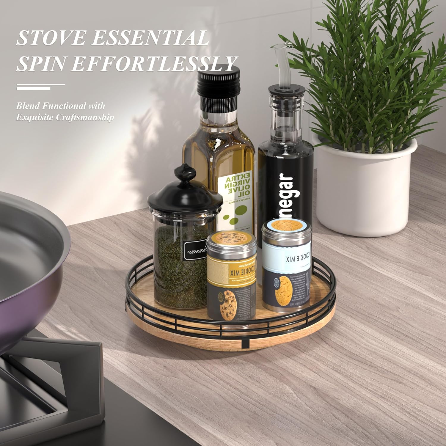 • 360 RATATING & MAXIMIZE SPACE: The base is made of solid wood and the spinning mechanism is made of steel ball bearings, which are well-built and allow for 360° smoothly spin. Making it super easy to access items at the back of your cabinet without having to remove everything in front. You can use it to store spices, condiments, and even small jars, and it keeps everything neatly in place.