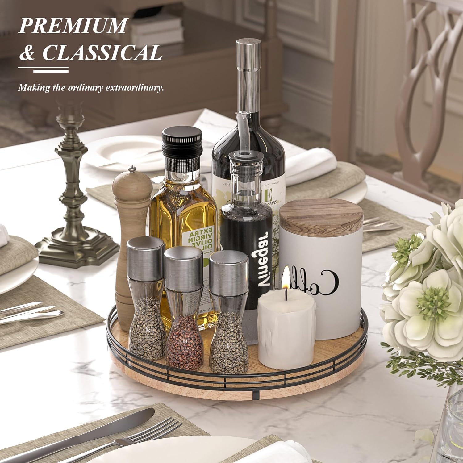 • PERFECT GIFTS: Perfect for a wedding, Birthday, housewarming gift, Mother's Day gift, or centerpiece for any occasions. Tastefully packaged, our turntable organization makes a thoughtful and practical gift for someone who loves home organization. No assembly was required.