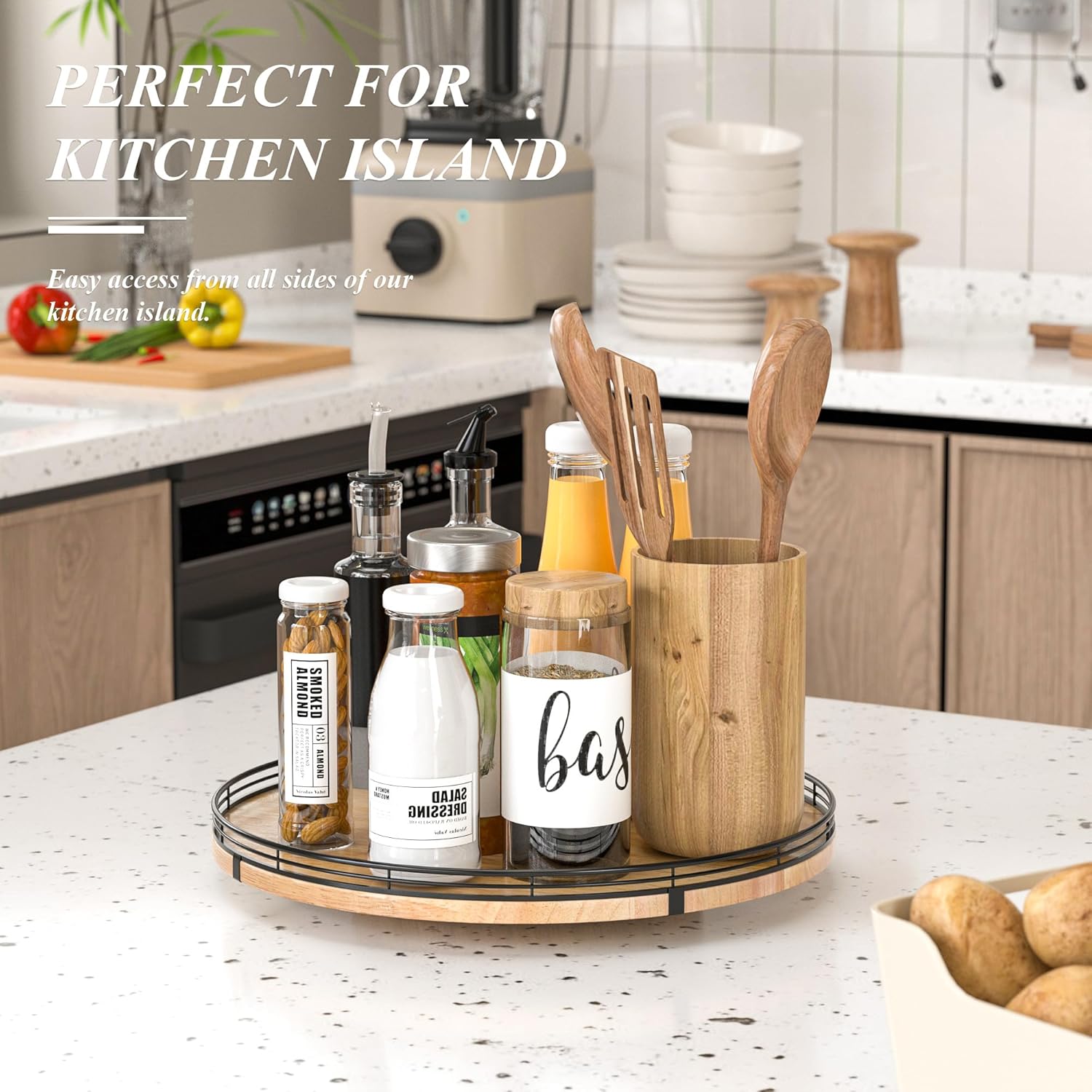 • PREMIUM MATERIAL: Our farmhouse lazy Susan organizer is made of natural solid oak wood and strong metal, sturdy, durable and premium quality. This wooden turntable organizer is a game-changer for keeping your kitchen organized. The farmhouse oak finish gives it a rustic, charming look that will fit perfectly with your kitchen decor.