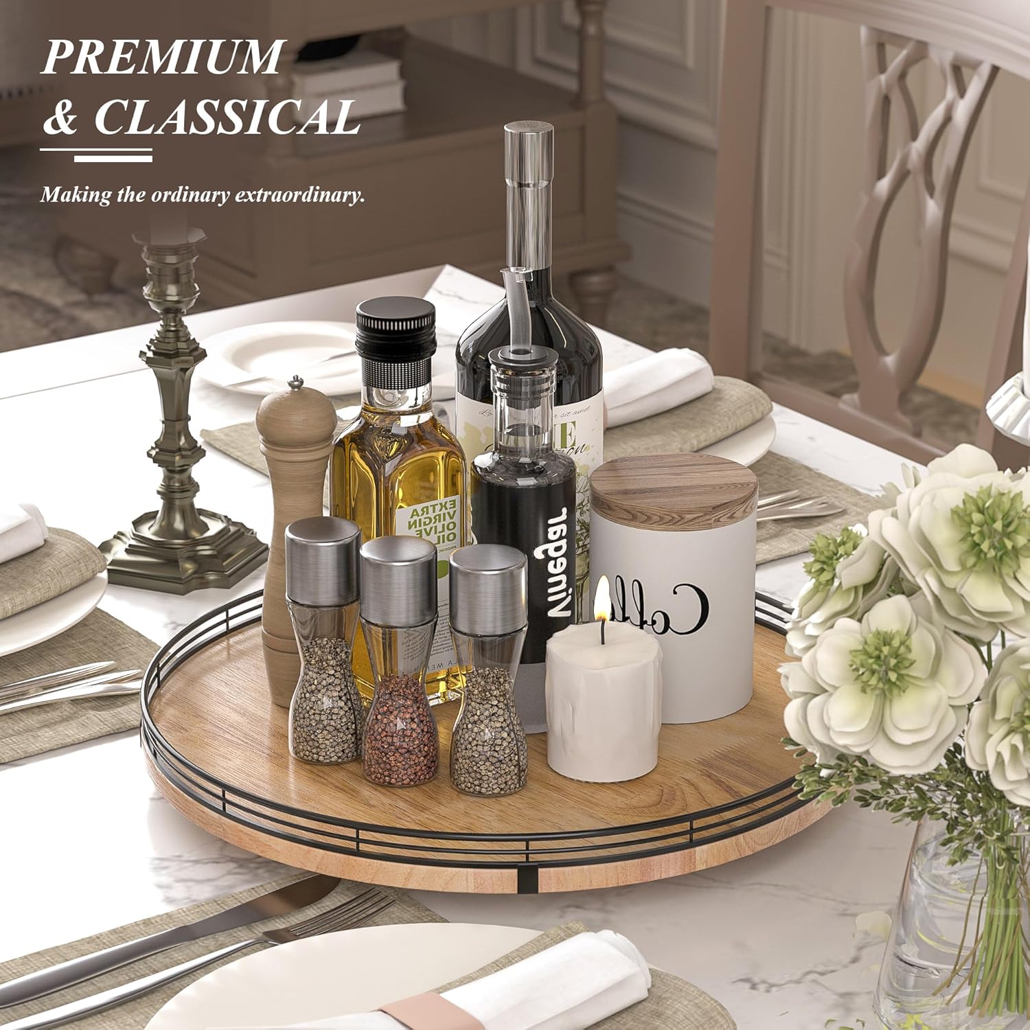 • UPDATED DESIGN: With larger wood base on this lazy Susan for table top, the turntable organizer doesn't wobble, even with heavier items on it. With premium oak wood and classical iron fence make this lazy Susan turntable stylish, functional and adding a touch of rustic charm. it’s also very easy to clean. There are included anti-slip pads on the bottom of the lazy Susan for extra surface protection.