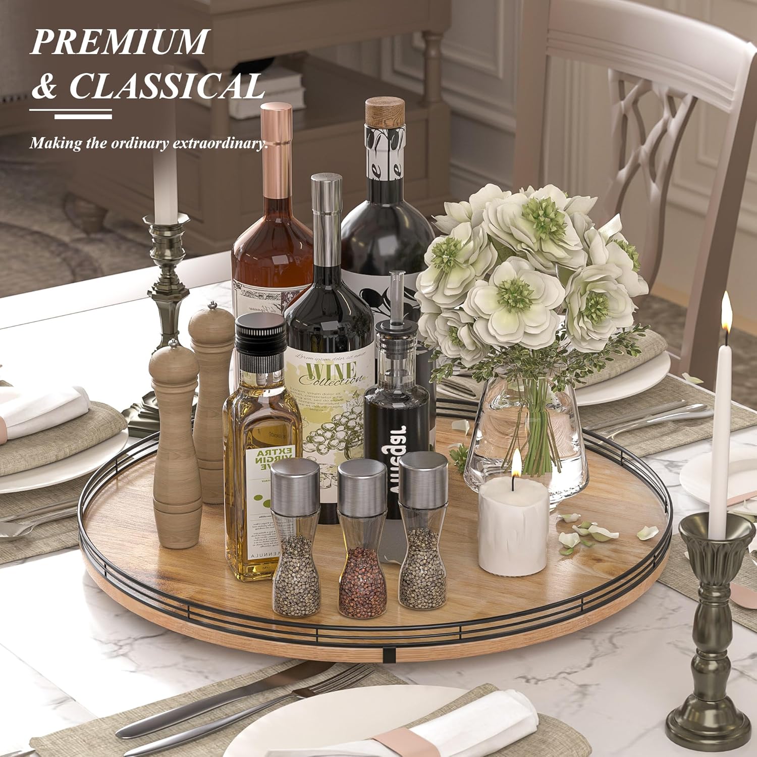 • PREMIUM MATERIAL: Our farmhouse lazy Susan organizer is made of natural solid oak wood and strong metal, sturdy, durable and premium quality. This wooden turntable organizer is a game-changer for keeping your kitchen organized. The farmhouse oak finish gives it a rustic, charming look that will fit perfectly with your kitchen decor.