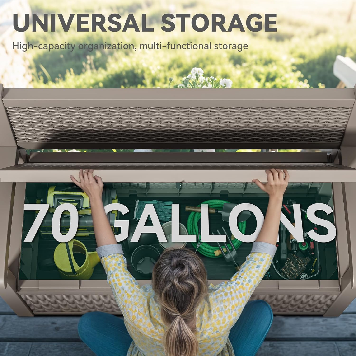 YITAHOME 70 Gallon Storage Bench Deck Box, Lockable Patio Bench, Waterproof Outdoor Pool Deck Storage for Patio Cushions, Garden Tools and Pool Supplies, Light Brown
