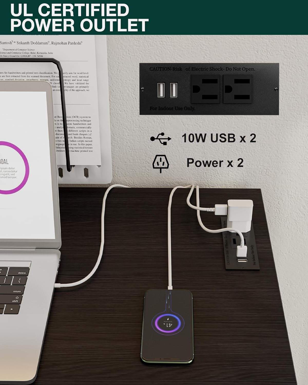 • 👍𝗜𝗡𝗧𝗘𝗚𝗥𝗔𝗧𝗘𝗗 𝗣𝗢𝗪𝗘𝗥 𝗛𝗨𝗕 – 𝗖𝗛𝗔𝗥𝗚𝗘 𝗘𝗩𝗘𝗥𝗬𝗧𝗛𝗜𝗡𝗚 𝗔𝗧 𝗢𝗡𝗖𝗘 — Stay powered and productive with 2 built-in AC outlets and 2 USB ports—perfect for laptops, phones, tablets, and more. No more messy extension cords or reaching for distant plugs; this smart design keeps all your devices charged and your workspace neat