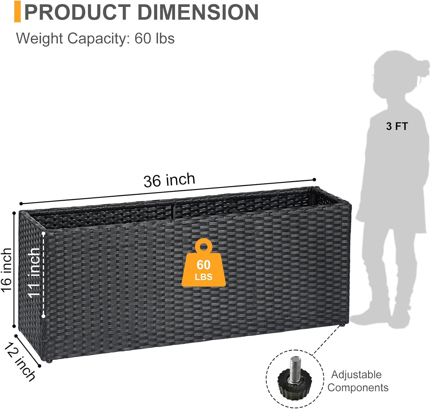 • Product Details - Dimensions (LxWxH) Plant pot: 36 x 12 x 16 inch Material: PE rattan, Powder-coated Steel, Plastic , Adjustable Feet