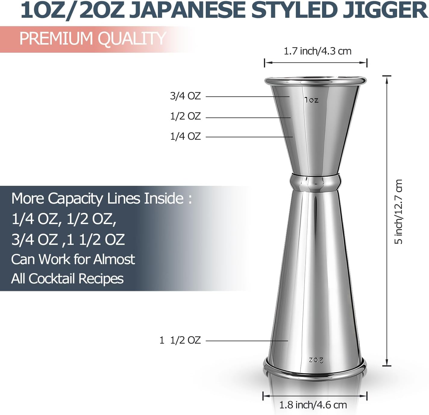• Included Components : 20/28OZ Boston Shaker, Double-Side Jigger (30ml/60ml), Mixing Spoon (25cm Length), Hawthorne Strainer, Fine Mesh Strainer, Liquid Pourer with Cap, Muddler, Corkscrew, Bottle Stopper, Ice Tong, Zester, Lemon Squeezer, Stainless Straw, Cocktail Pick, Cocktail Stirrer, Brush for Cleaning Straw/Pourer, Storage Glass, 39-Recipe Cocktail Cards, Bamboo Stand. 20/28OZ Boston Shaker, Double-Side Jigger (30ml/60ml), Mixing Spoon (25cm Length), Hawthorne Strainer, Fine Mesh Strainer, Liquid… See more