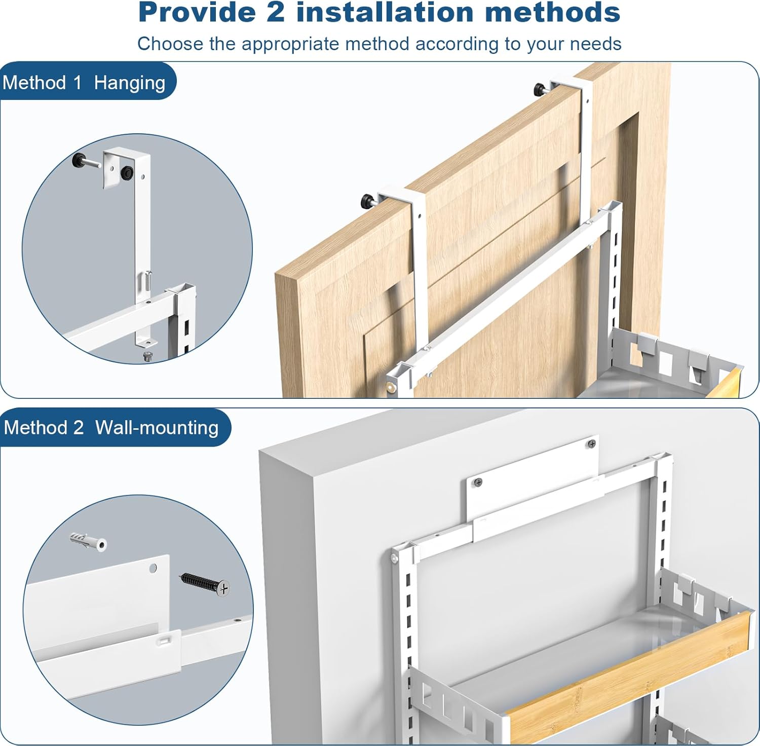 • 【Adjustable and Detachable】You can adjust the height of each layer of the door kitchen rack to fit your cans, spices or other items of different sizes, which works well for your various storage needs.The basket can be easily removed and placed where you want