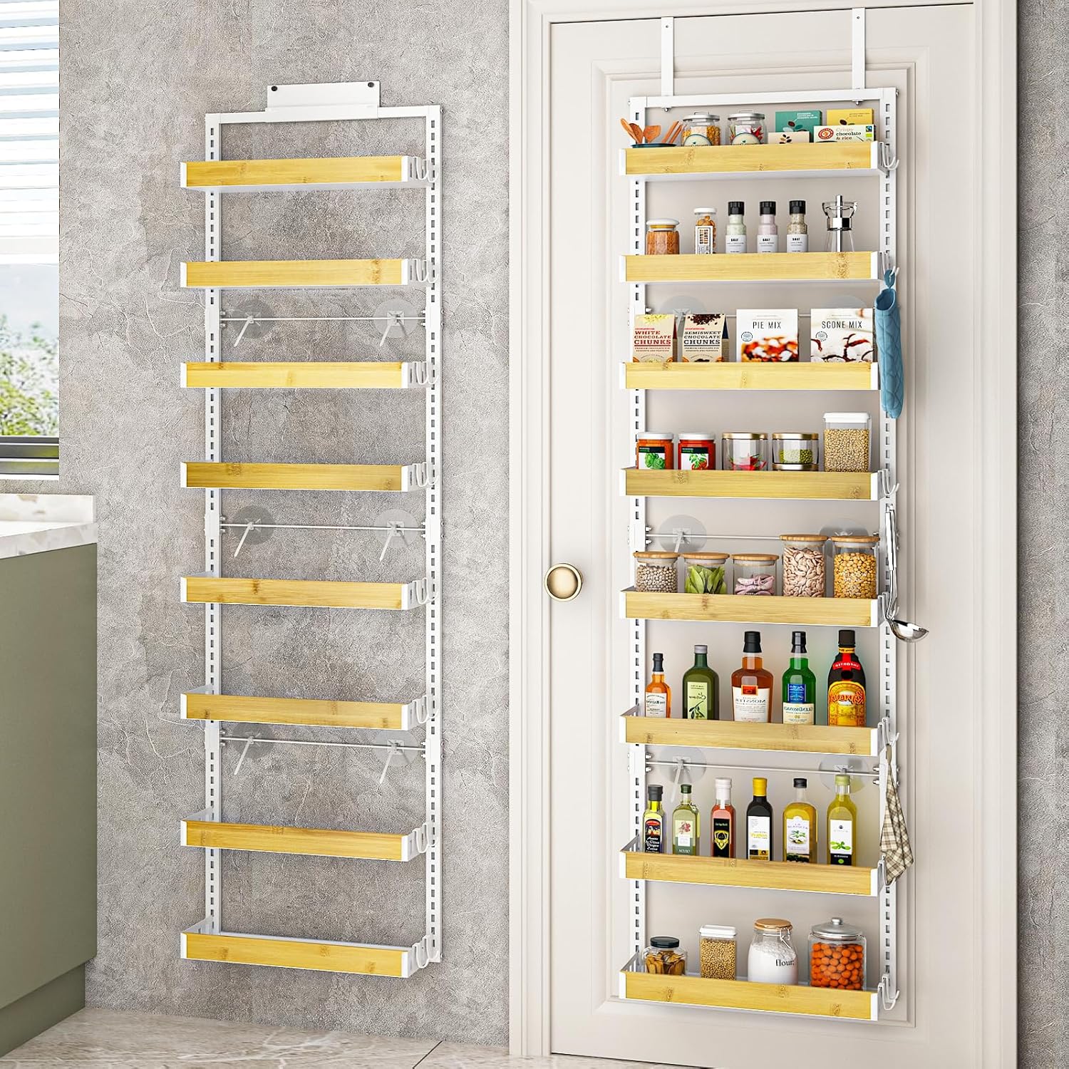 bukfen Over the Door Pantry Organizer 8-Tier Adjustable Basket Kitchen Pantry Door Organization and Storage, 2 in 1 Wall Mount or Hanging Heavy-Duty Metal Hanging Kitchen Spice Rack