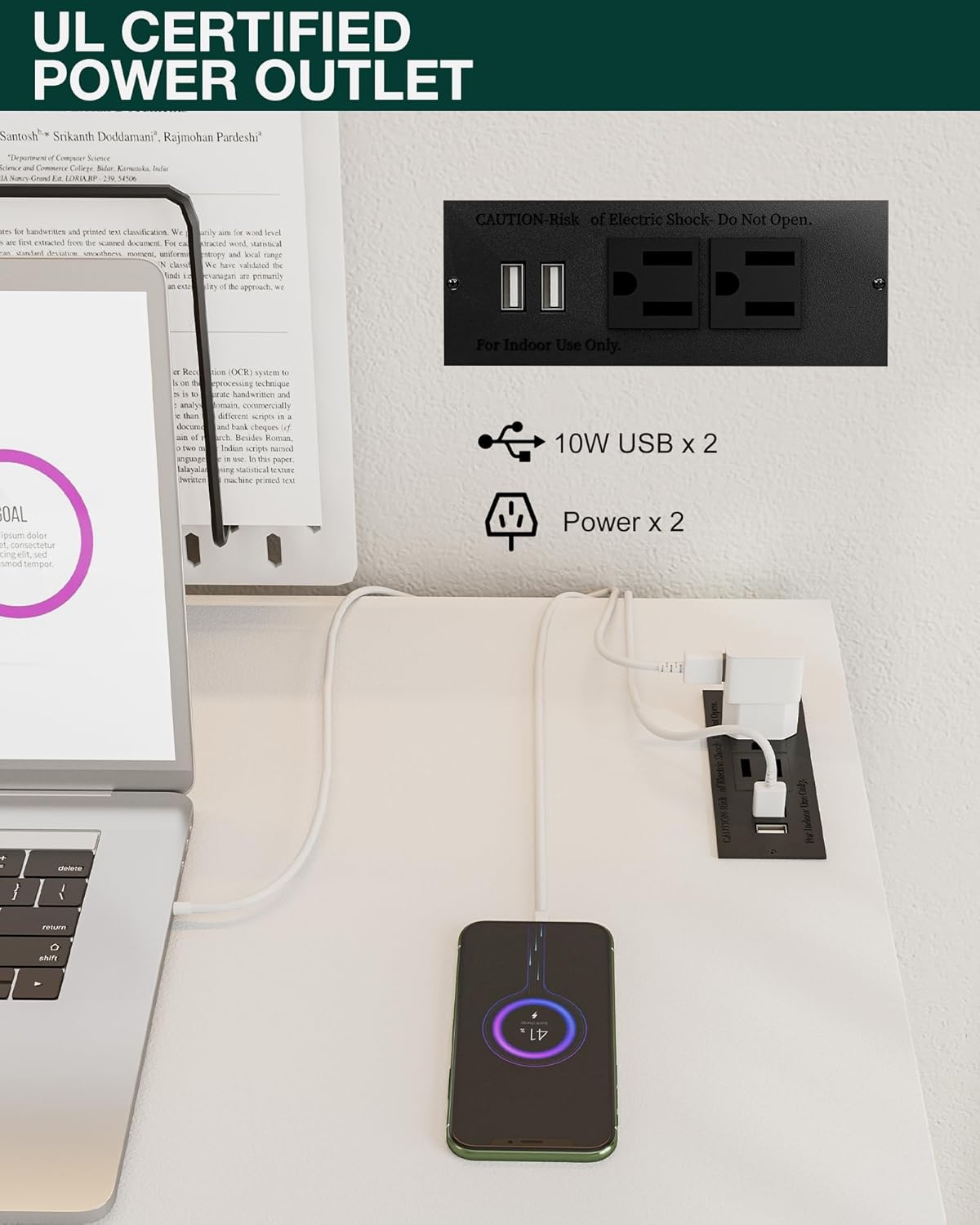 • 👍𝗜𝗡𝗧𝗘𝗚𝗥𝗔𝗧𝗘𝗗 𝗣𝗢𝗪𝗘𝗥 𝗛𝗨𝗕 – 𝗖𝗛𝗔𝗥𝗚𝗘 𝗘𝗩𝗘𝗥𝗬𝗧𝗛𝗜𝗡𝗚 𝗔𝗧 𝗢𝗡𝗖𝗘 — Stay powered and productive with 2 built-in AC outlets and 2 USB ports—perfect for laptops, phones, tablets, and more. No more messy extension cords or reaching for distant plugs; this smart design keeps all your devices charged and your workspace neat