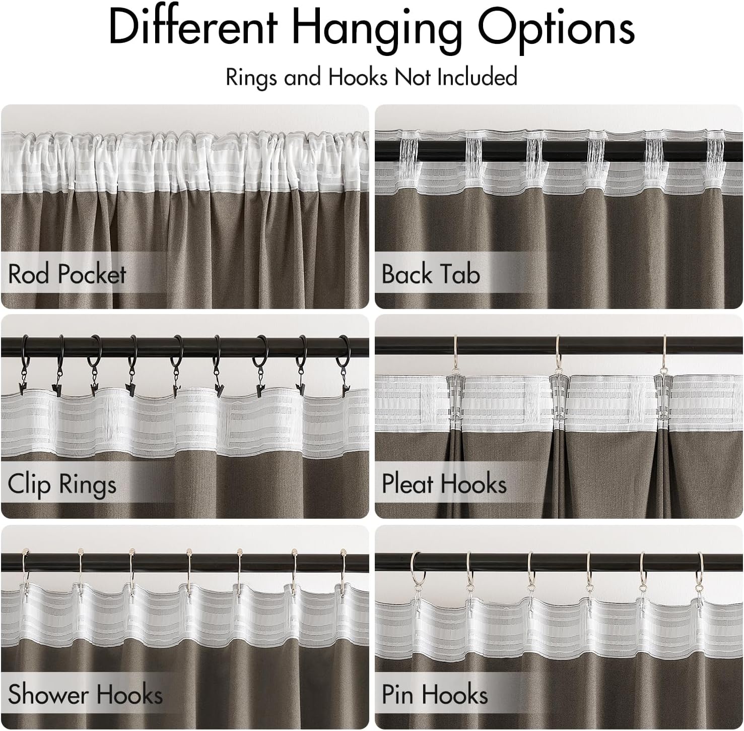 • HANGING OPTIONS: Each curtain panel has 3-in-1 top style design: rod pocket, back tab and pinch pleat. Back loop (2.3 inch) and rod pocket (3.1 inch) fit most standard rod. Curtains also can be hung with clip rings or curtain hooks. 3 ways to meet your various needs.