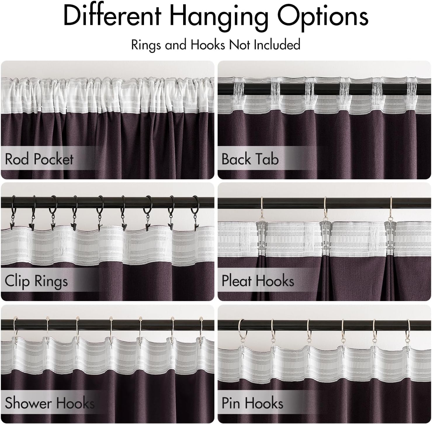 • HANGING OPTIONS: Each curtain panel has 3-in-1 top style design: rod pocket, back tab and pinch pleat. Back loop (2.3 inch) and rod pocket (3.1 inch) fit most standard rod. Curtains also can be hung with clip rings or curtain hooks. 3 ways to meet your various needs.
