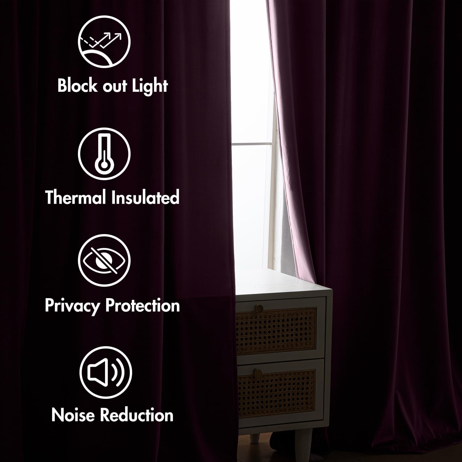 • FUNCTION: Craft from thick velvet, curtains can block 80% of the sunlight. Also, these drapes can keep heat down in summer or keep cold out in winter to achieve smart energy saving. And these panels can provide privacy, reduce noise, which help to create a quiet sleeping environment.