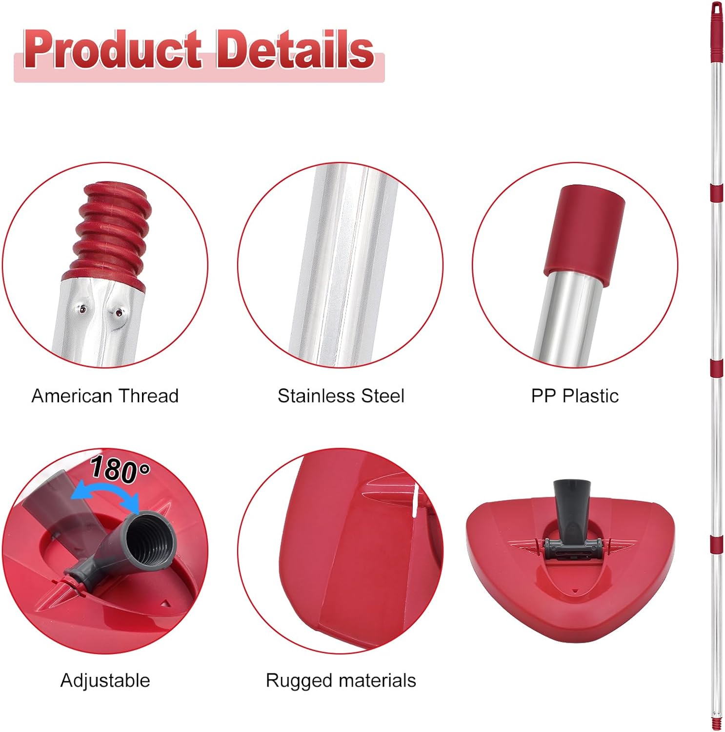 • Easy to install: 4-Section Mop handle and base set is built for long-lasting performance, crafted from high-quality stainless steel and durable plastic. Its simple installation allows you to quickly set up and get to work, making your cleaning routine more efficient and hassle-free.