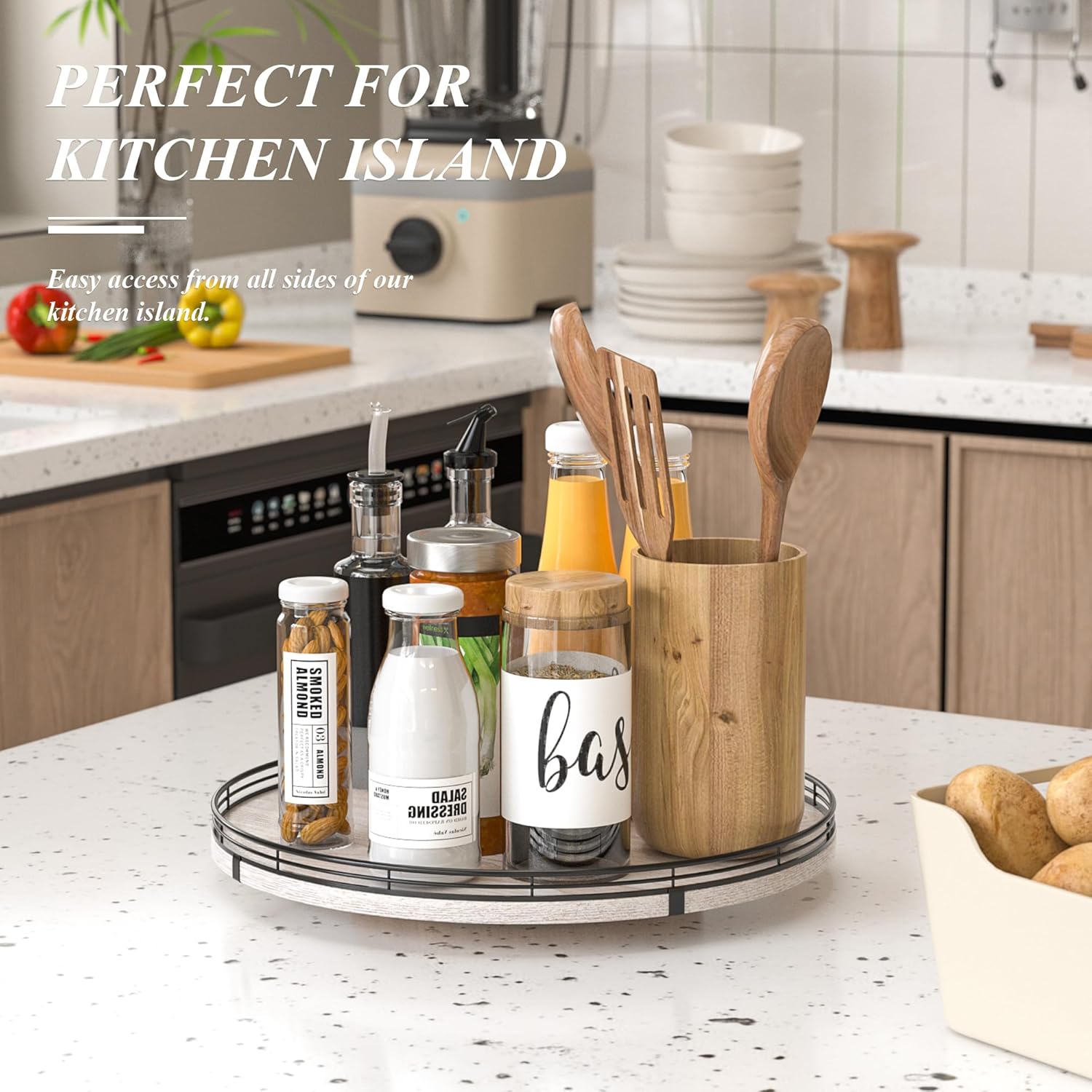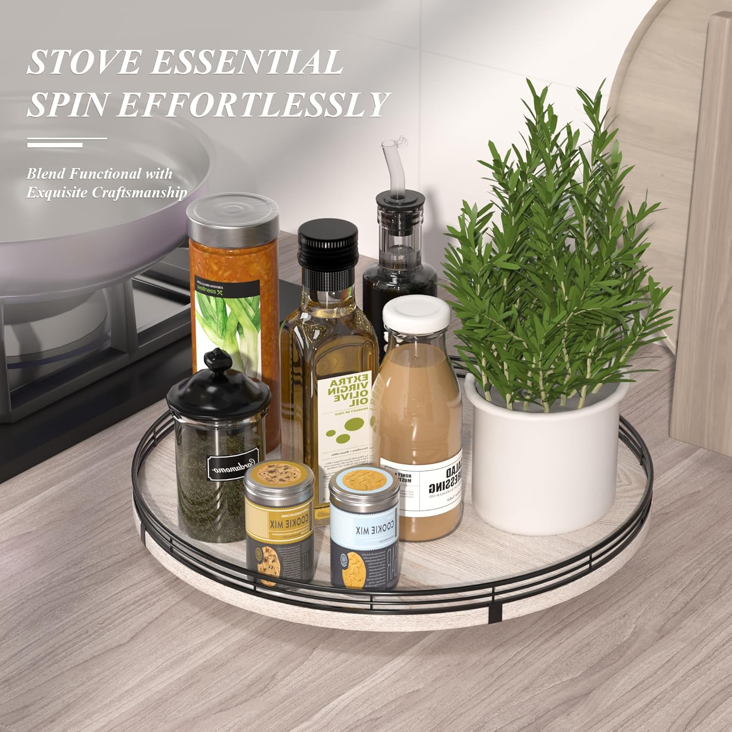 • 360 RATATING & MAXIMIZE SPACE: The base is made of solid wood and the spinning mechanism is made of steel ball bearings, which are well-built and allow for 360° smoothly spin. Making it super easy to access items at the back of your cabinet without having to remove everything in front. You can use it to store spices, condiments, and even small jars, and it keeps everything neatly in place.