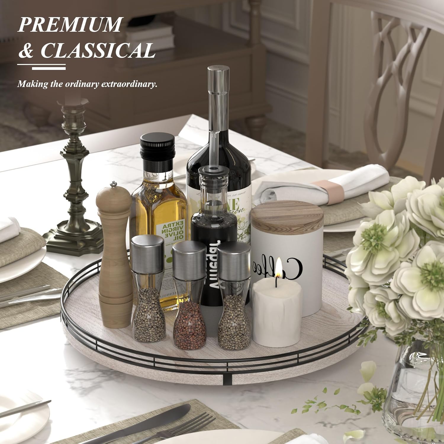 • PERFECT GIFTS: This wooden tray can not only be served as a lazy Susan to organize, but also be served as a decorative tray to decor your coffee table, dining table, kitchen, home with its charmed rustic farmhouse style. Perfect for a wedding, Birthday, housewarming gift, Mother's Day gift, or centerpiece for any occasions. Tastefully packaged, our turntable organization makes a thoughtful and practical gift for someone who loves home organization and home decoration. No assembly was required.