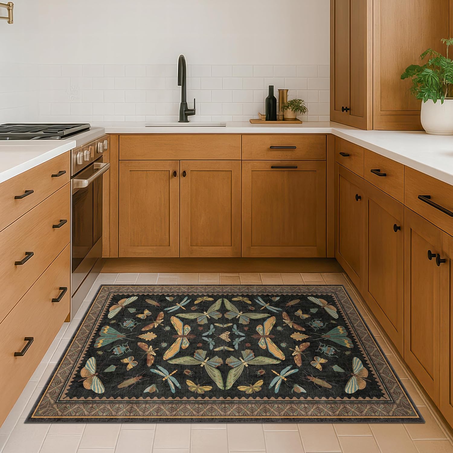 3x5 Entryway Rug Non Slip Washable - Black Throw Rug for Kitchen, Mudroom, Bedroom Bedside, Insect Boho Vintage Aesthetic Décor