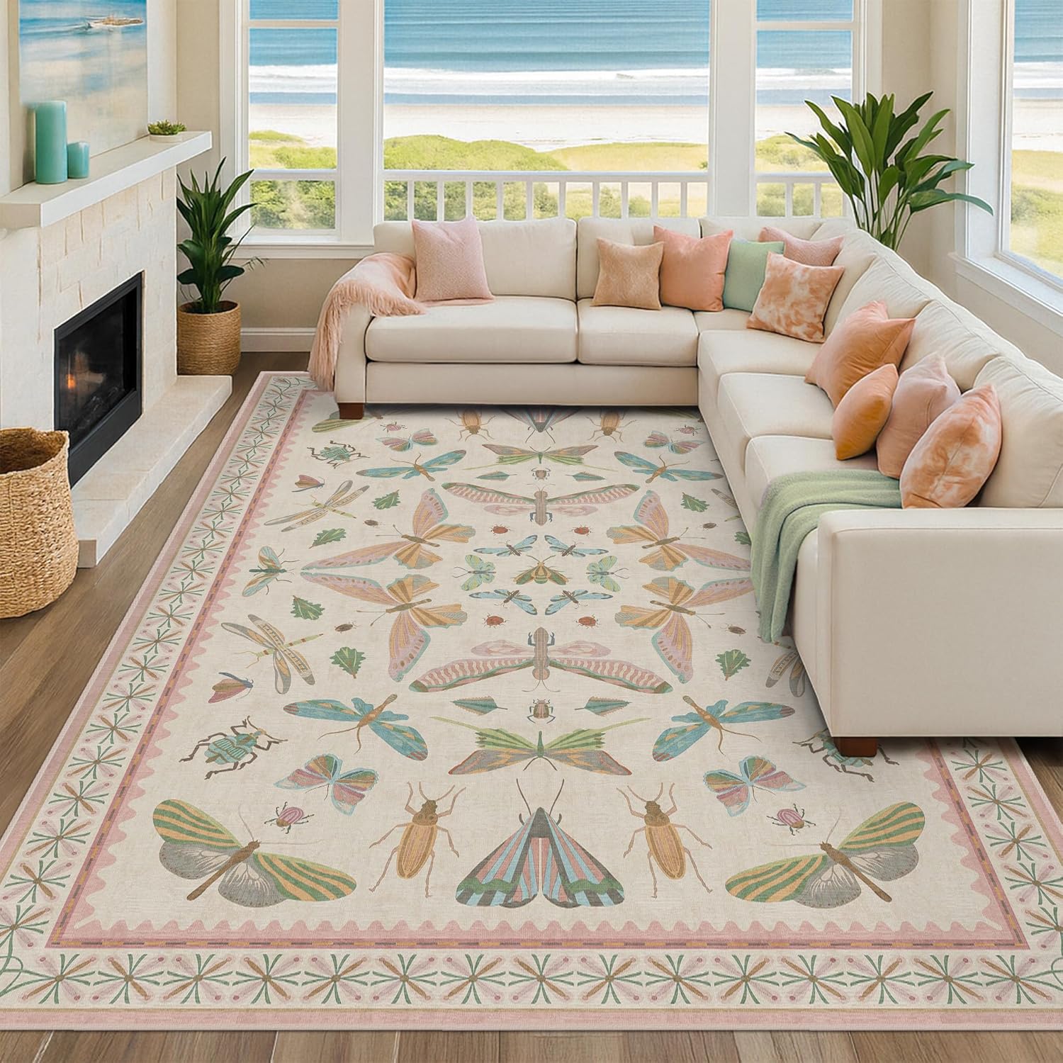 • Whimsical Nature Aesthetic: Brighten your space with this washable rug featuring delicate butterflies, moths, beetles & dragonflies on a soft ivory base. A pastel palette of blush pink, sage green, sky blue, and golden mustard offers cheerful, vintage charm. Its symmetrical layout and scalloped edge echo antique scientific illustrations, blending playful character with timeless design. Framed by a warm pink and green floral border, it's perfect for girls bedroom, nurseries, or boho interiors
