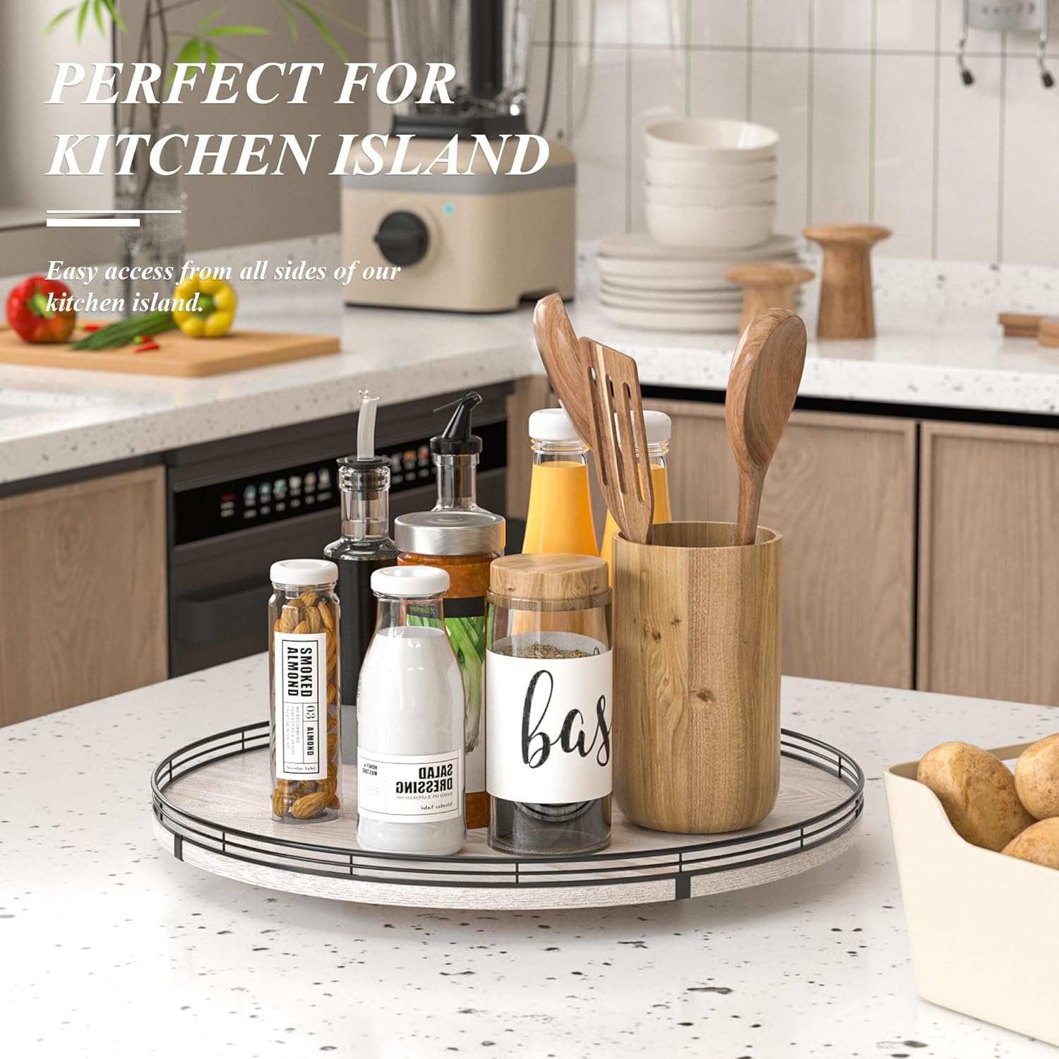 • PREMIUM MATERIAL: Our farmhouse large lazy Susan organizer is made of natural wood and strong Iron, sturdy, durable and premium quality. This wooden turntable organizer is a game-changer for keeping your kitchen organized. The farmhouse finish gives it a rustic, charming look that will fit perfectly with your kitchen decor.