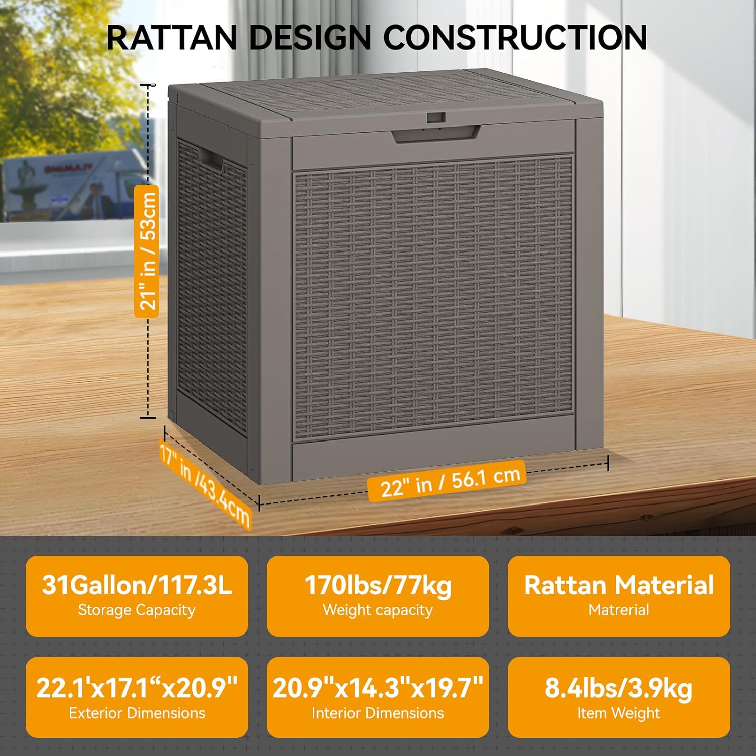 • Immense Storage Capacity: With dimensions of 22.1in x 17.1in x 20.8in, this deck box offers perfect storage space for all your outdoor essentials. It can hold up to 31 gallons of garden tools, pool supplies, patio furniture, cushions, and more.