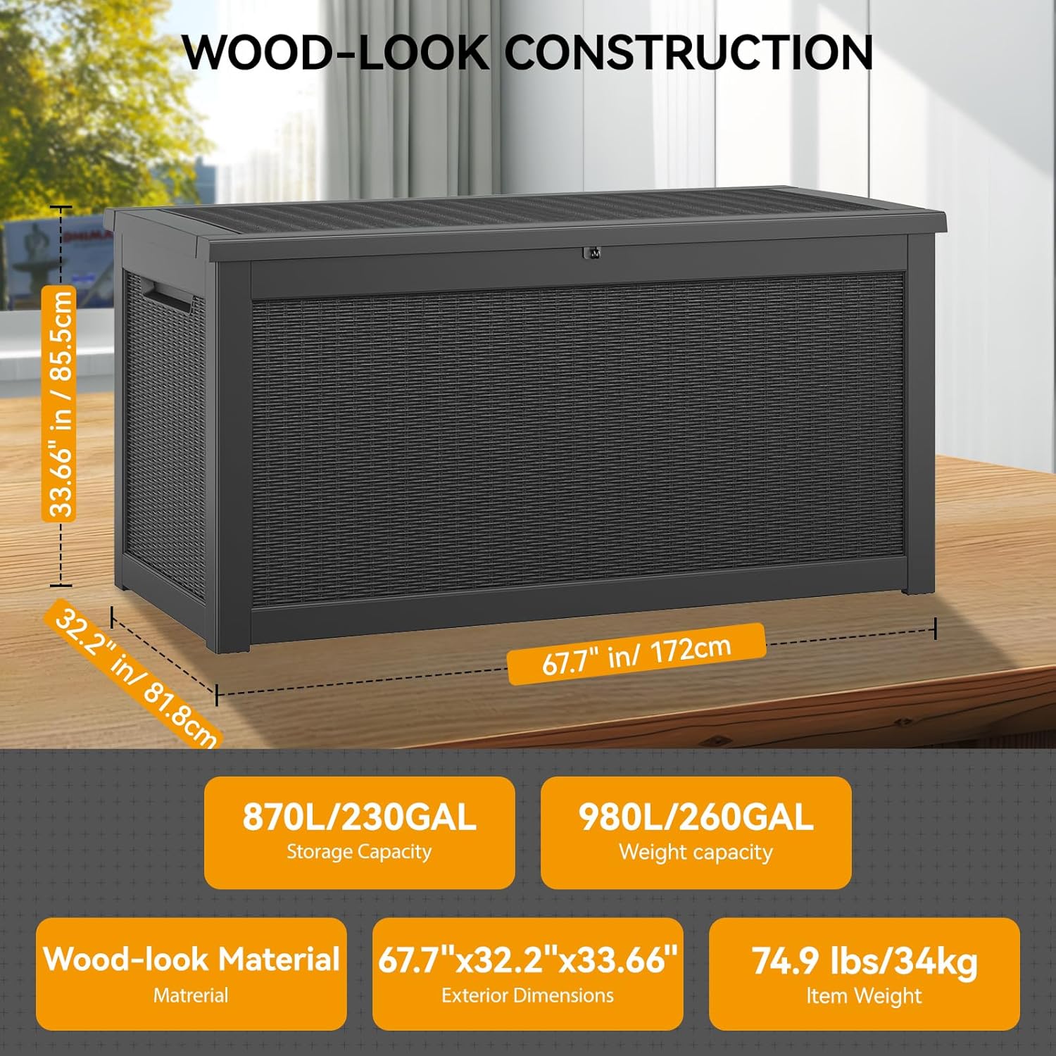 • Immense Storage Capacity: With dimensions of 67.7 x 32.2 x 33.6 inches, this deck box offers perfect storage space for all your outdoor essentials. It can hold up to 180 gallons of garden tools, pool supplies, patio furniture, cushions, and more.