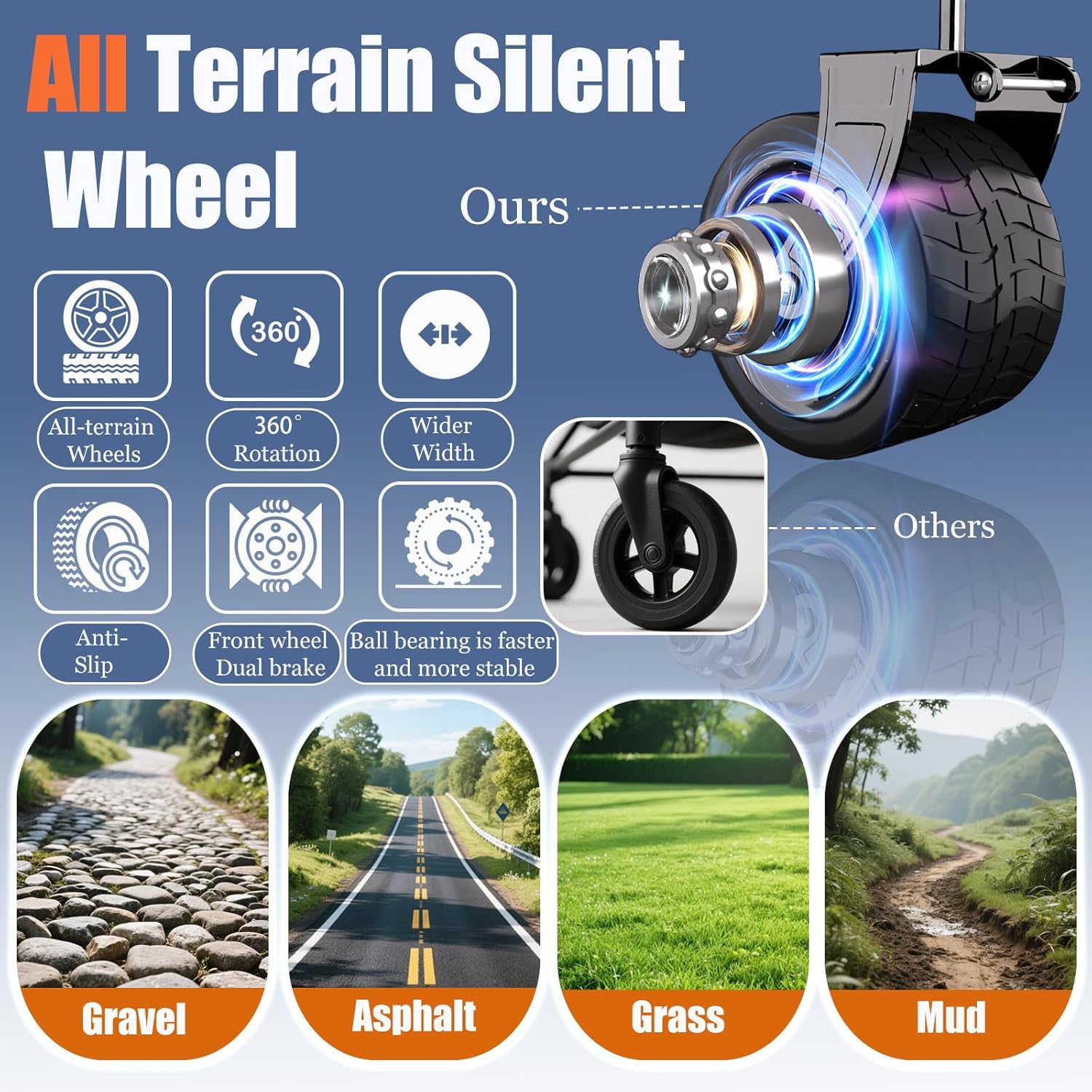 • All-Terrain Wheels for Smooth Mobility:This beach carts is equipped with 4 oversized all terrain wheels measuring 7 "x4", which can easily glide on various surfaces, including sandy, grassy, and rugged terrain. Two 360 ° rotating front wheels with brakes ensure maneuverability, while the sturdy structure provides stability even on uneven ground. Very suitable for beach travel, camping, or outdoor activities