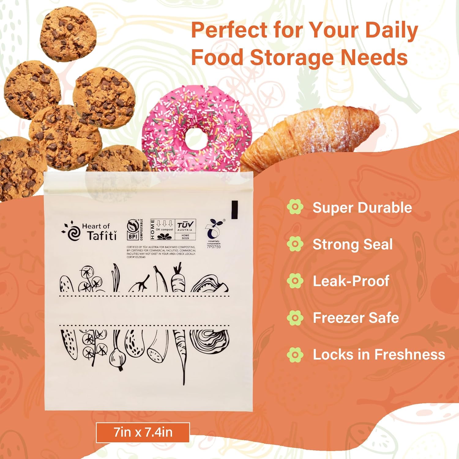 • Certified Compostable in U.S. & Europe: Heart of Tafiti resealable food storage bags are certified compostable, meeting the highest-rated standards, including ASTM D6400, European EN 13432, and BPI certification, ensuring they decompose in industrial composting facilities.