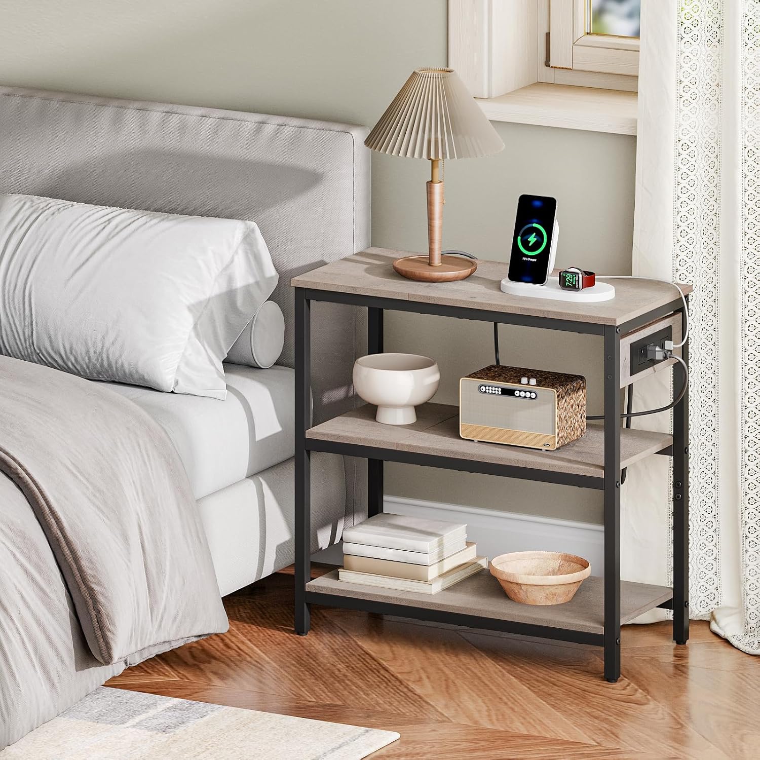 HOOBRO End Table with Charging Station, Simple Rustic Side Table with 3-Tier Storage Shelf, Narrow Nightstand for Small Spaces, for Living Room, Industrial Design, Greige and Black BG149UBZ01
