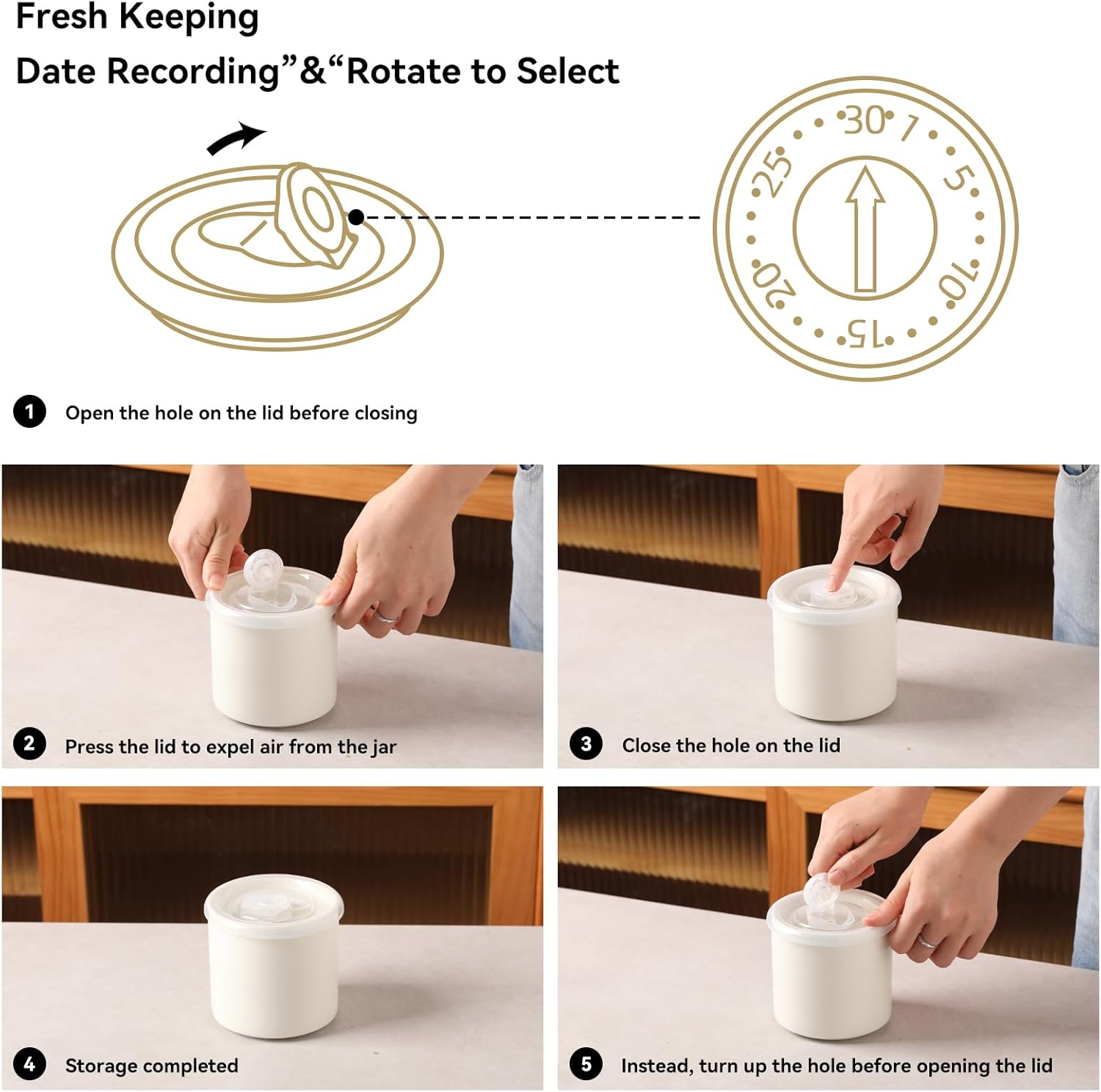 • Built-in Date Tracking System - The innovative rotating dial (MM/DD) on the lid can clearly mark the storage date at a glance. Use expiration reminders to reduce food waste. At the same time, flipping the dial can open or close the air holes, which is conducive to the preservation of the items inside and enhances the tightness of the cover.