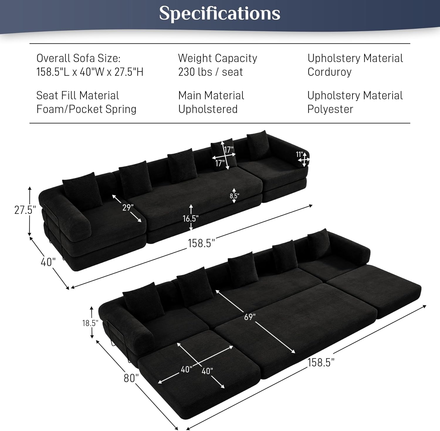 • Black Corduroy Boneless Couch with Generous Dimensions: With generous dimensions of 78.5"L x 37"W x 27"H as a sofa and 78.5"L x 74"W x 8.25"H when converted into a sleeper, this sofa bed queen offers ample space for lounging, sleeping, or entertaining guests. Its spacious design ensures that you and your guests enjoy optimal comfort, making vacuum sealed Boneless couch the perfect foldable sofa bed for any home.