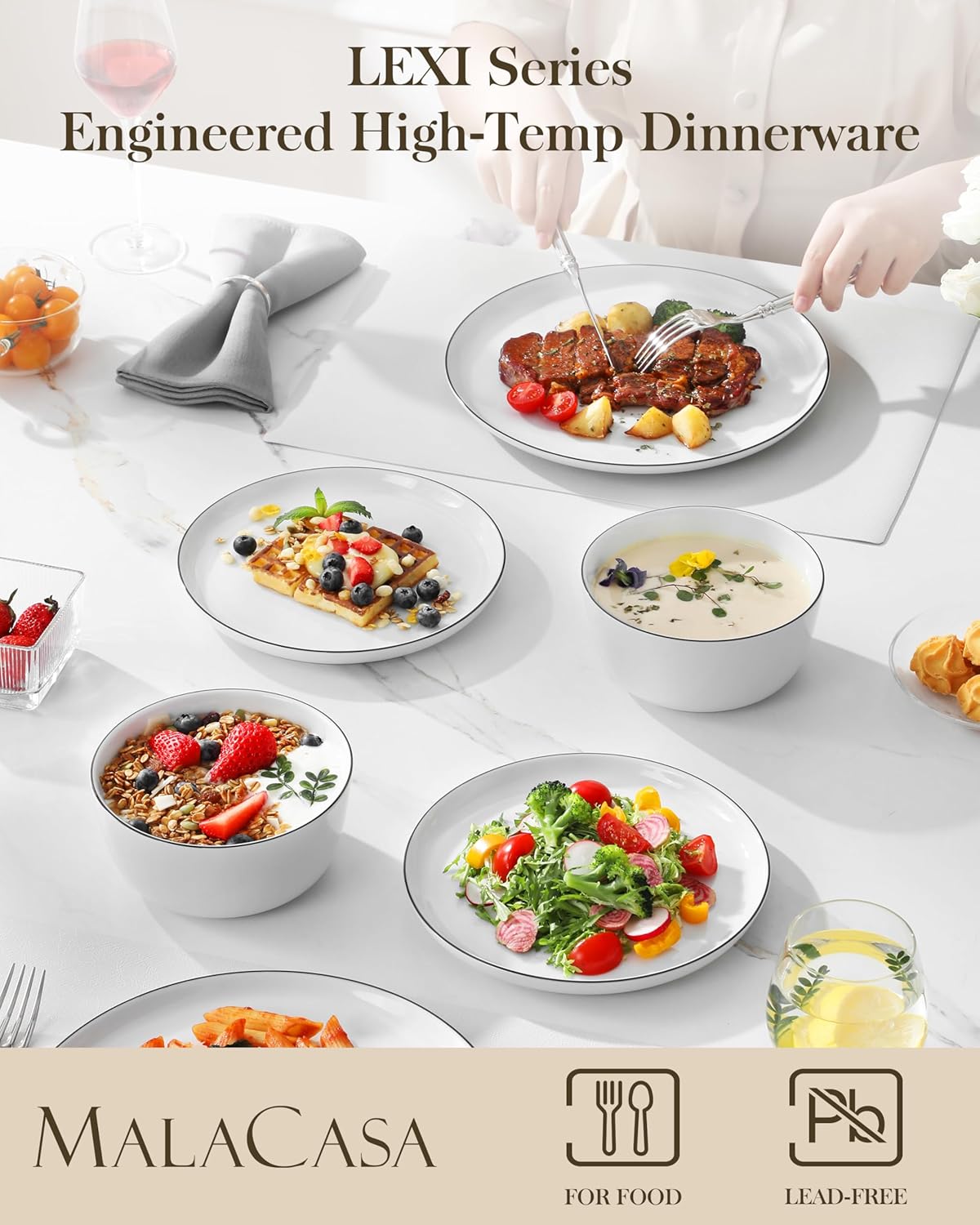 MALACASA 24 Pieces Gourmet Porcelain Dinnerware Sets, Premium Plates and Bowls Set, High-Fired Dishes Set for 8, Chip & Scratch Resistant, Microwave Dishwasher Safe, White & Black Rim, Series LEXI