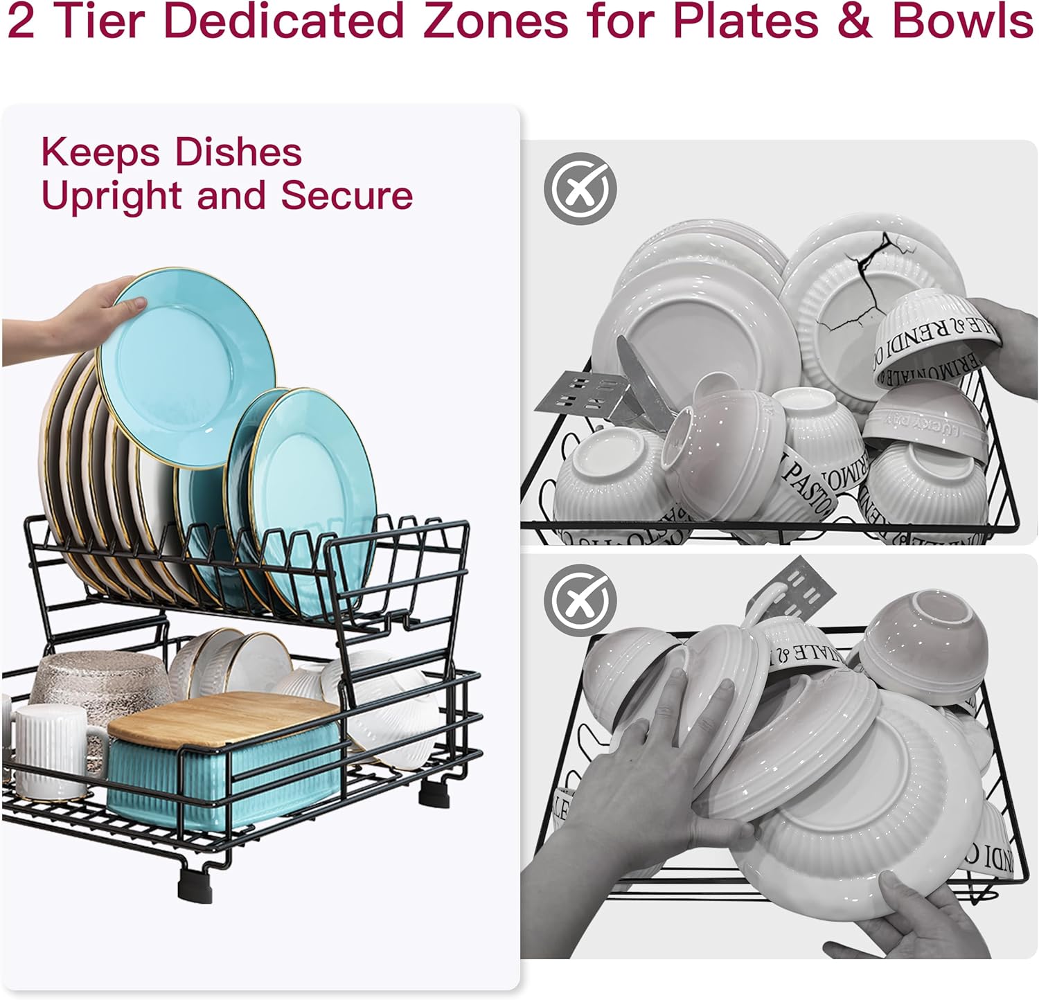 • 🔄 2-Tier Dish Rack for Kitchen Counter Storage: Dedicated zones for plates, bowls, and utensils. Sturdy frame prevents tipping—dish drainer rack keeps everything upright and secure