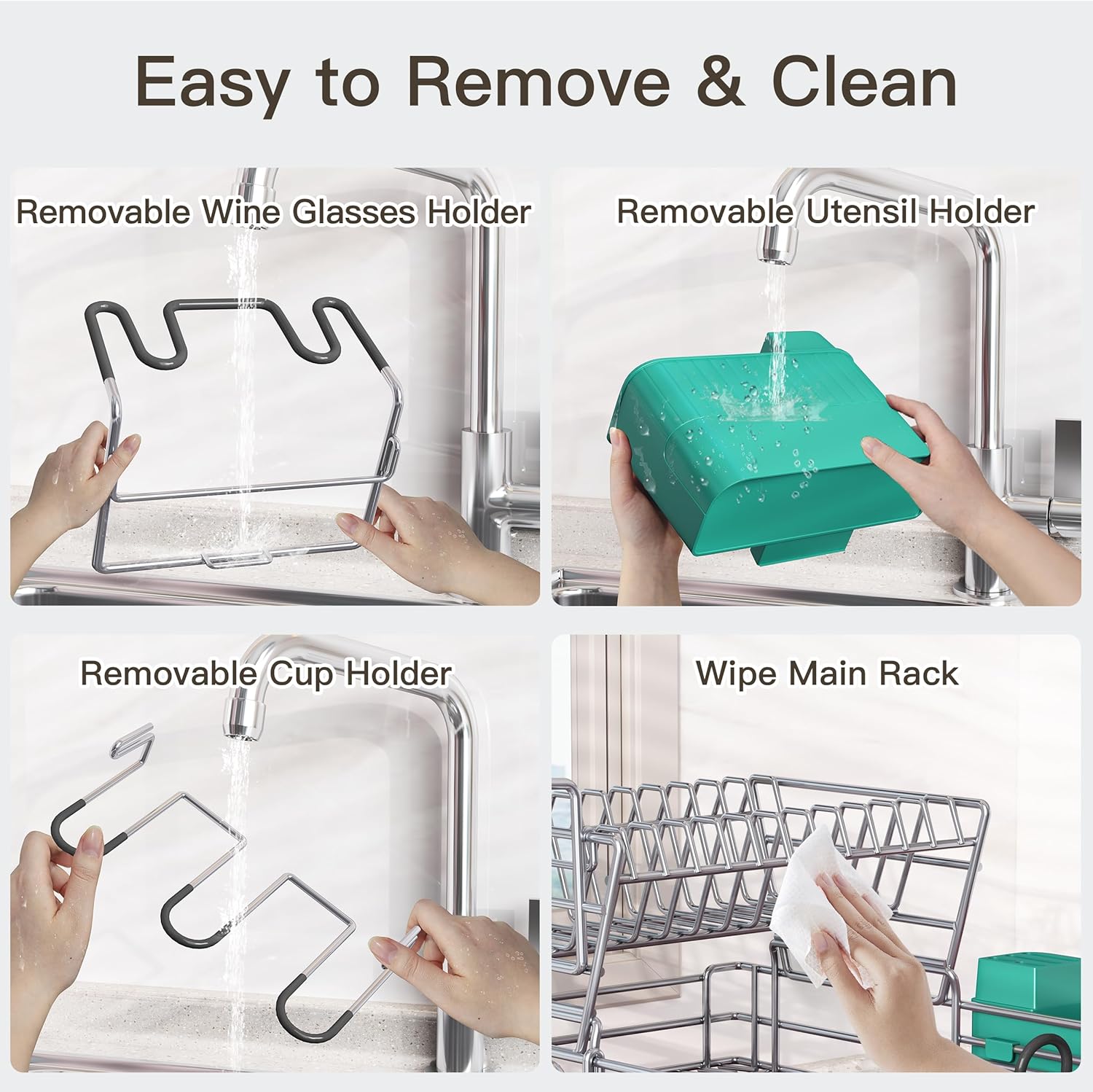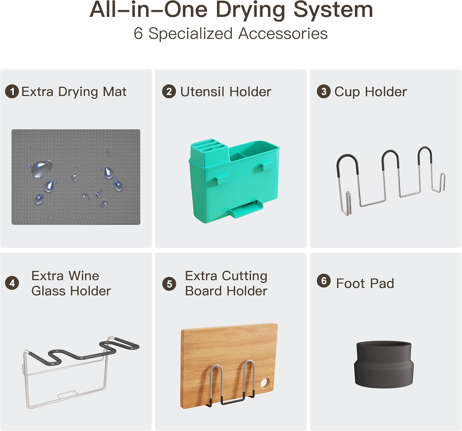 • 🛠️ All-in-One Drying System: 7 specialized accessories: drying mat, utensil holder, drainboard set, wine glass holder, cup holders, cutting board slot, non-slip feet cover. Stores all dish types vertically or horizontally. Maximizes small kitchens