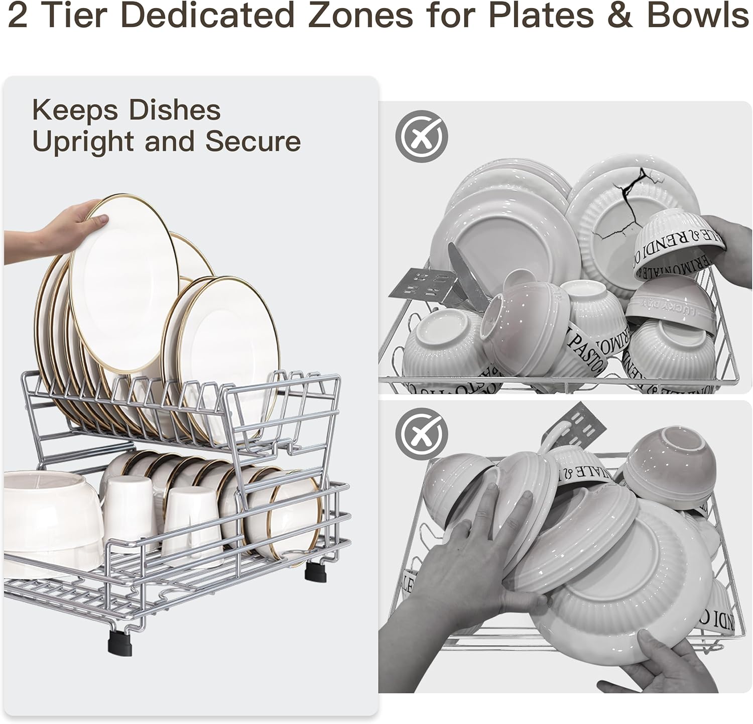 • 🔄 2-Tier Dish Rack for Kitchen Counter Storage: Dedicated zones for plates, bowls, and utensils. Sturdy frame prevents tipping—dish drainer rack keeps everything upright and secure